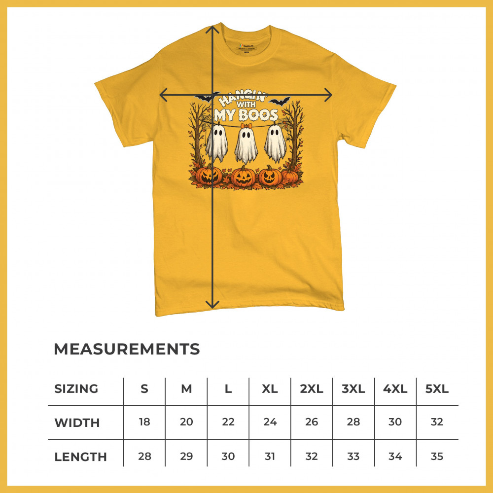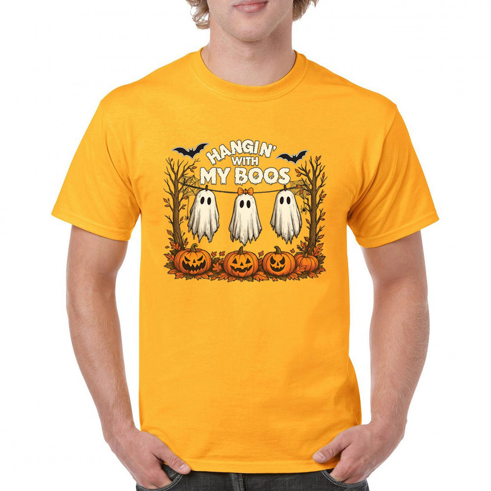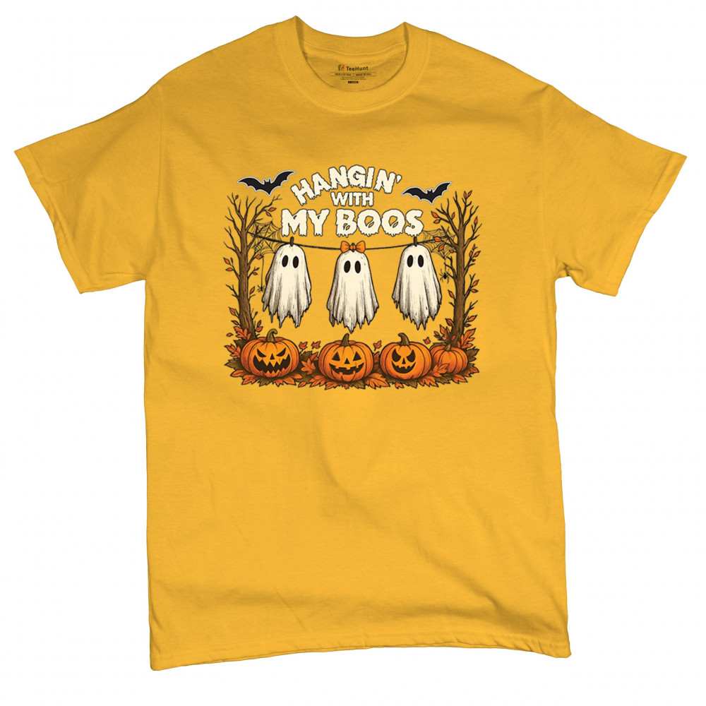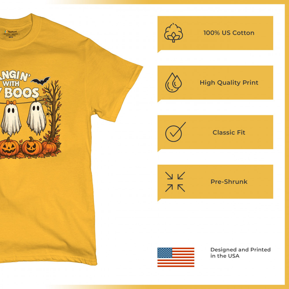 Hangin With My Boos design featuring spooky ghosts, jack o lanterns, and haunted house humor. Perfect for Halloween night, October 31, and parties.