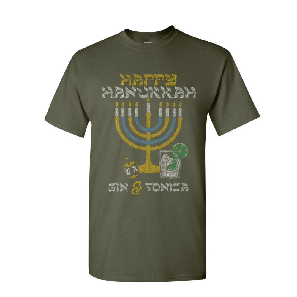 HAPPY HANUKKAH GIN & TONICA happy hanukkah t-shirt menorah drinking gin & tonica dreidel mens tee shirt military green