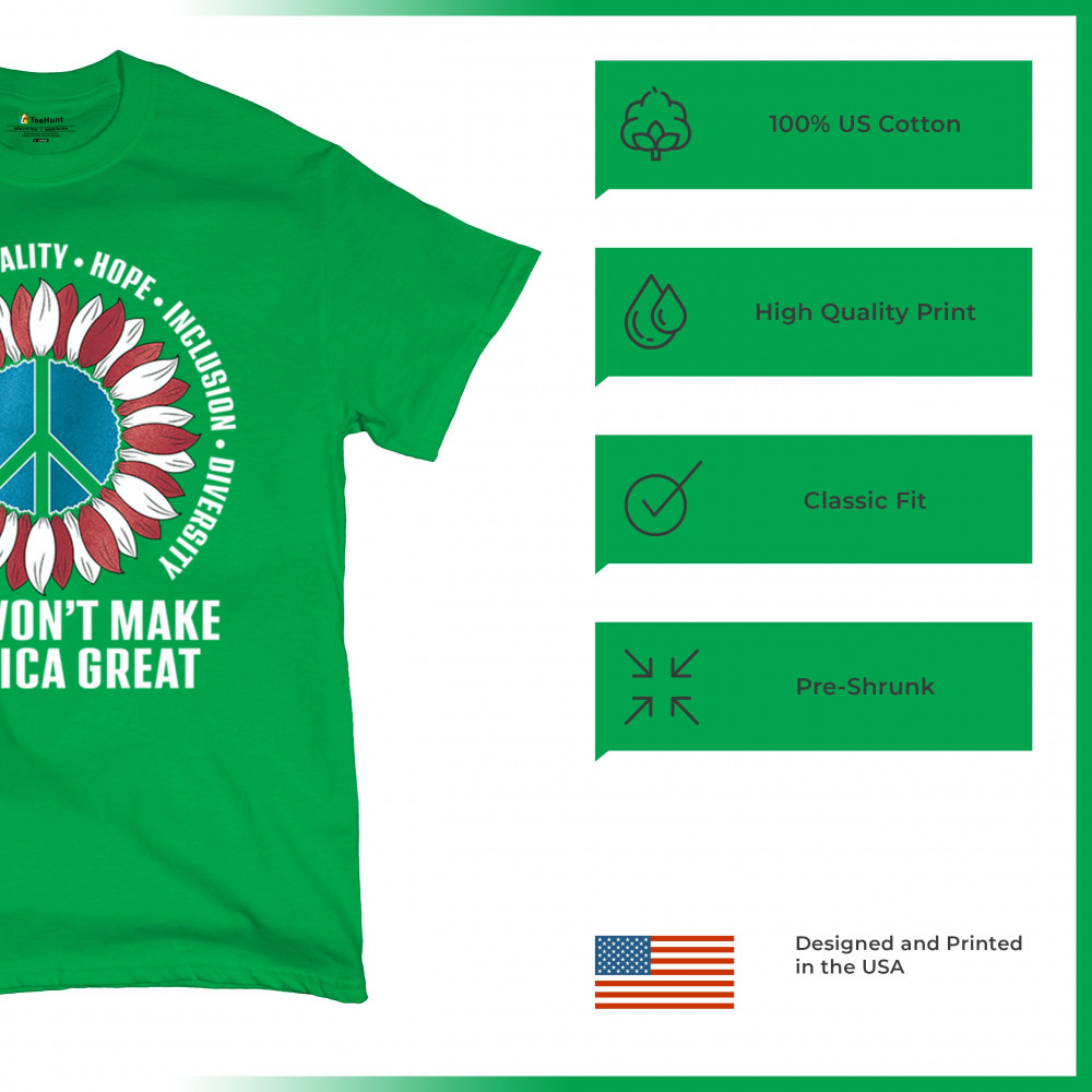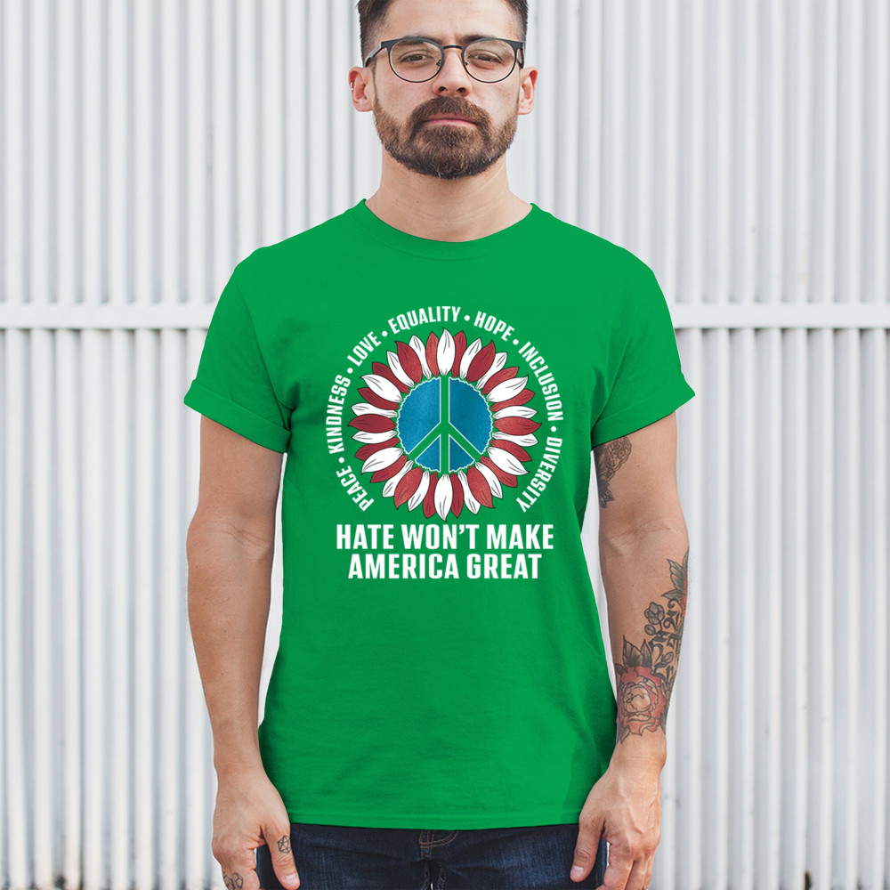 Embrace the message of love, equality, and unity with this eye-catching design. The sunflower and peace symbol represent a commitment to kindness and inclusion, rejecting hate and division. Perfect for those who support liberal values, this design is a bold statement against negativity and for a brighter future. Wear it proudly to show your belief in a diverse, united America. Let this design be a symbol of hope and progress for all.