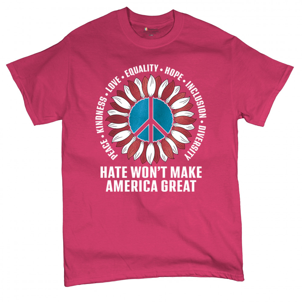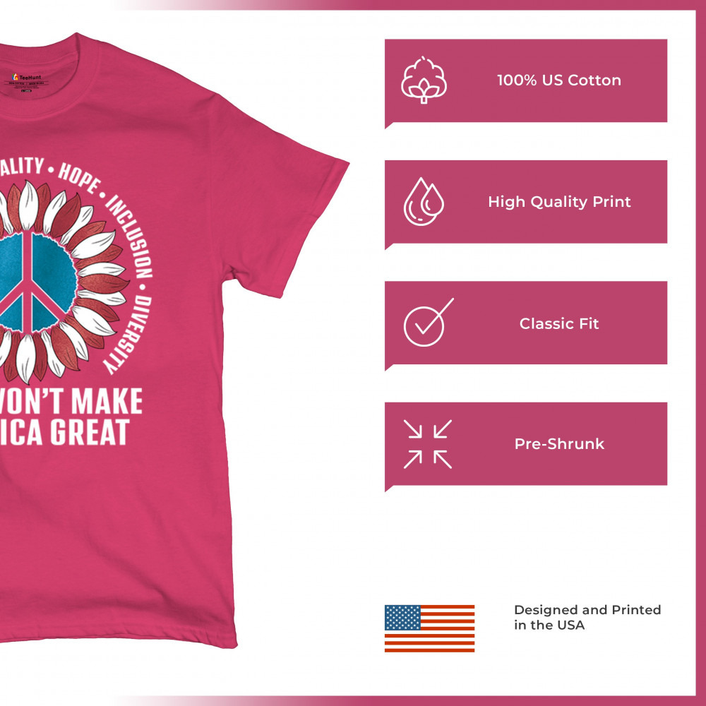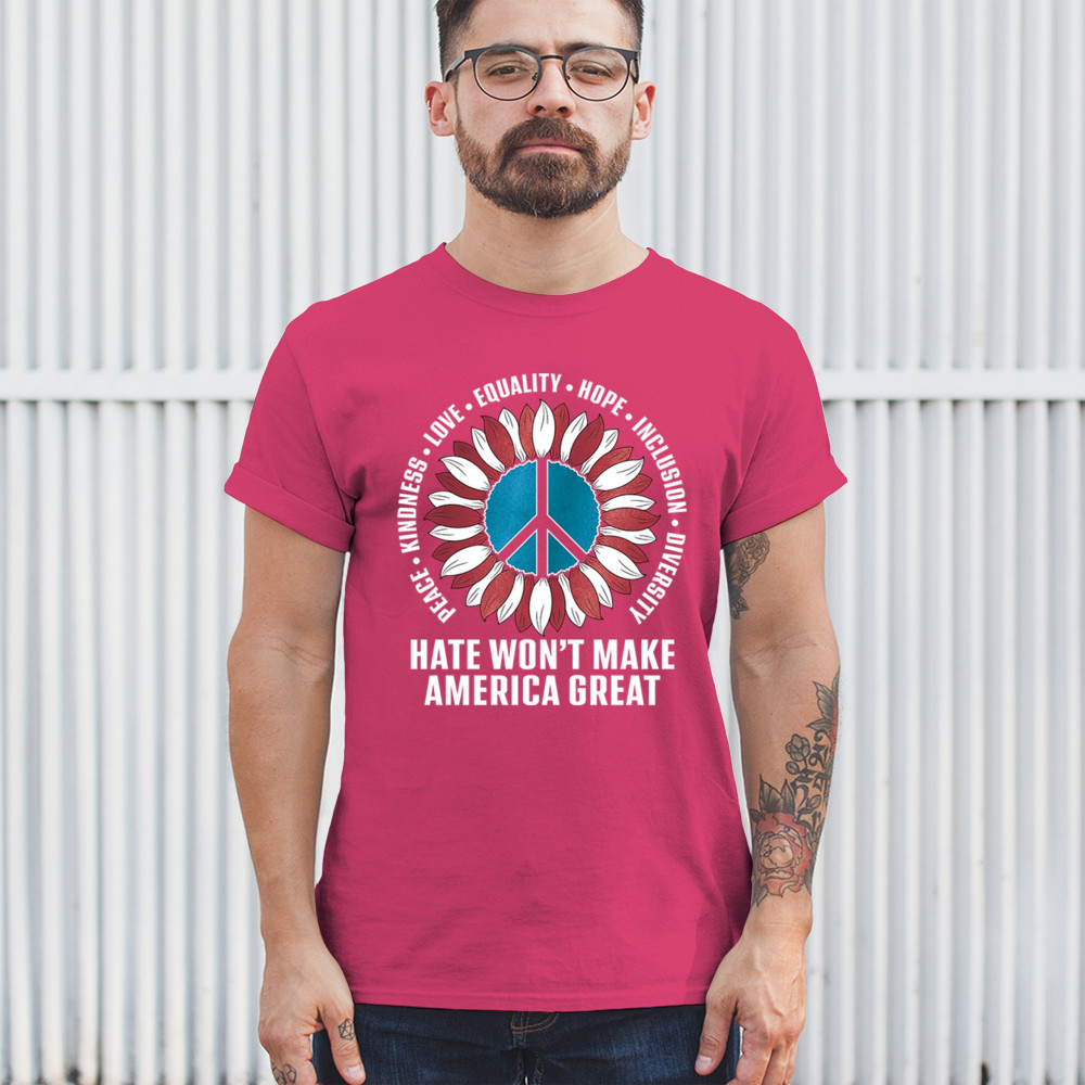 Embrace the message of love, equality, and unity with this eye-catching design. The sunflower and peace symbol represent a commitment to kindness and inclusion, rejecting hate and division. Perfect for those who support liberal values, this design is a bold statement against negativity and for a brighter future. Wear it proudly to show your belief in a diverse, united America. Let this design be a symbol of hope and progress for all.