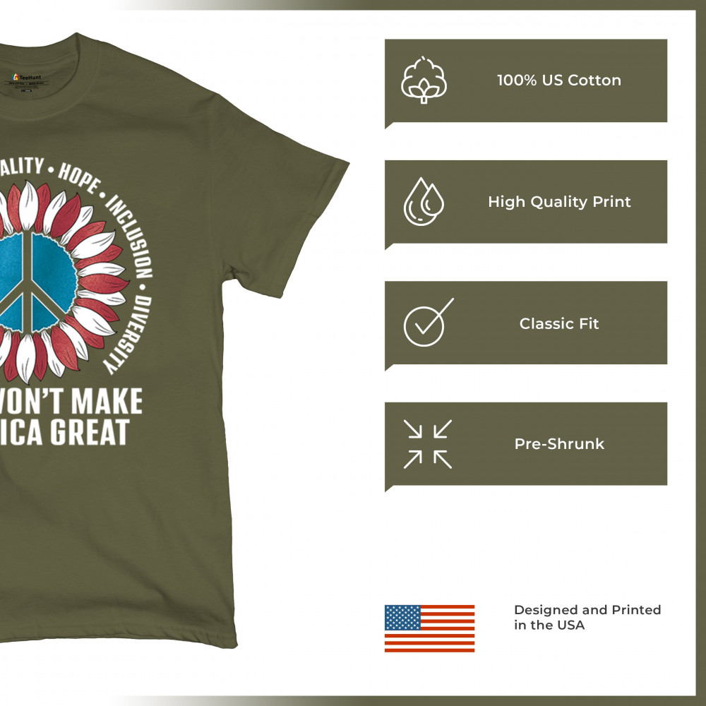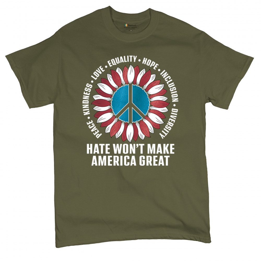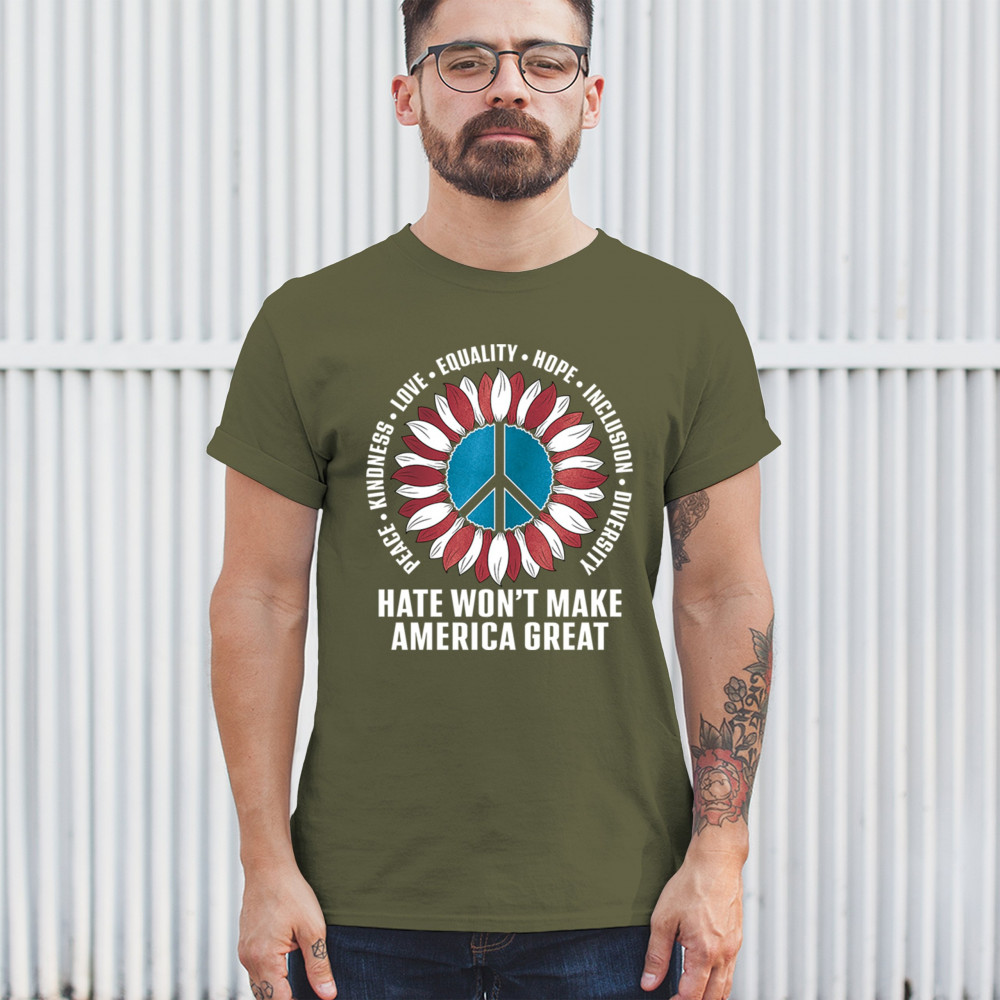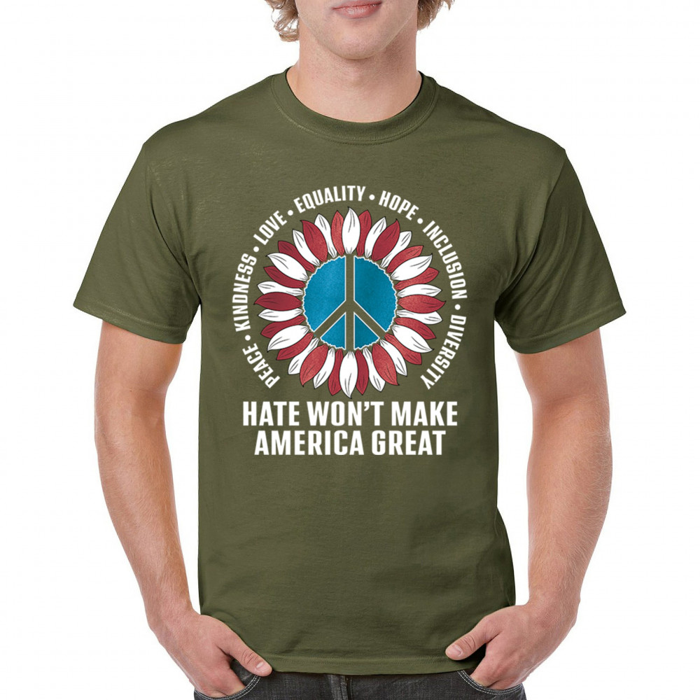 Embrace the message of love, equality, and unity with this eye-catching design. The sunflower and peace symbol represent a commitment to kindness and inclusion, rejecting hate and division. Perfect for those who support liberal values, this design is a bold statement against negativity and for a brighter future. Wear it proudly to show your belief in a diverse, united America. Let this design be a symbol of hope and progress for all.