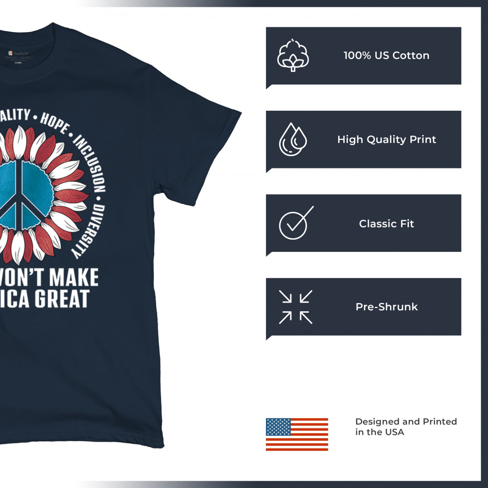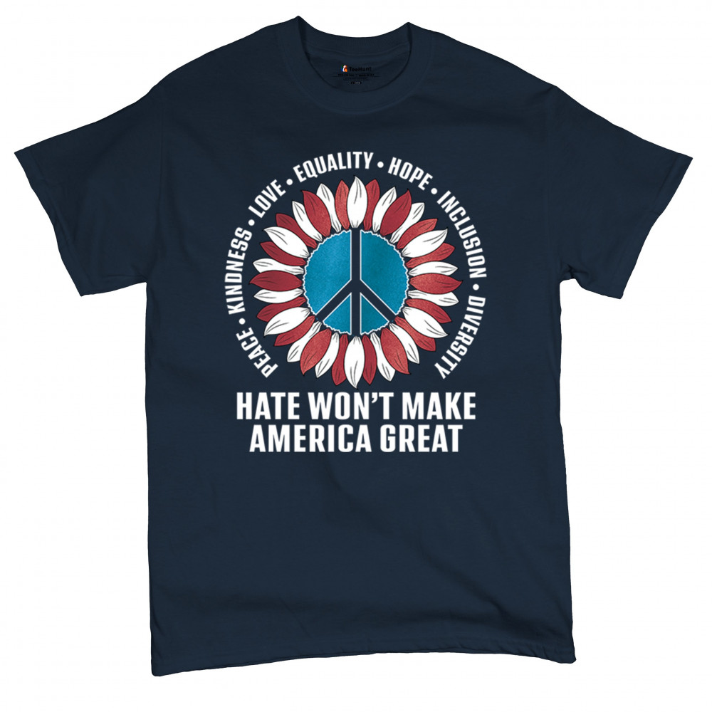 Embrace the message of love, equality, and unity with this eye-catching design. The sunflower and peace symbol represent a commitment to kindness and inclusion, rejecting hate and division. Perfect for those who support liberal values, this design is a bold statement against negativity and for a brighter future. Wear it proudly to show your belief in a diverse, united America. Let this design be a symbol of hope and progress for all.