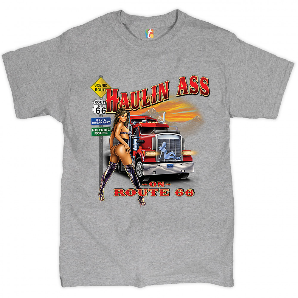 A print featuring a scantily-clad brunette woman standing by a Route 66 sign. A classic truck is passing by and the print says: "Haulin Ass on Route 66". A great choice for anyone who appreciates beautiful women and is a fan of the legendary Mother Road.