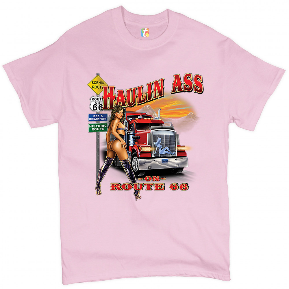 HAULIN ASS ON ROUTE 66 t-shirt historic route 66 trucker teamster men's tee light pink