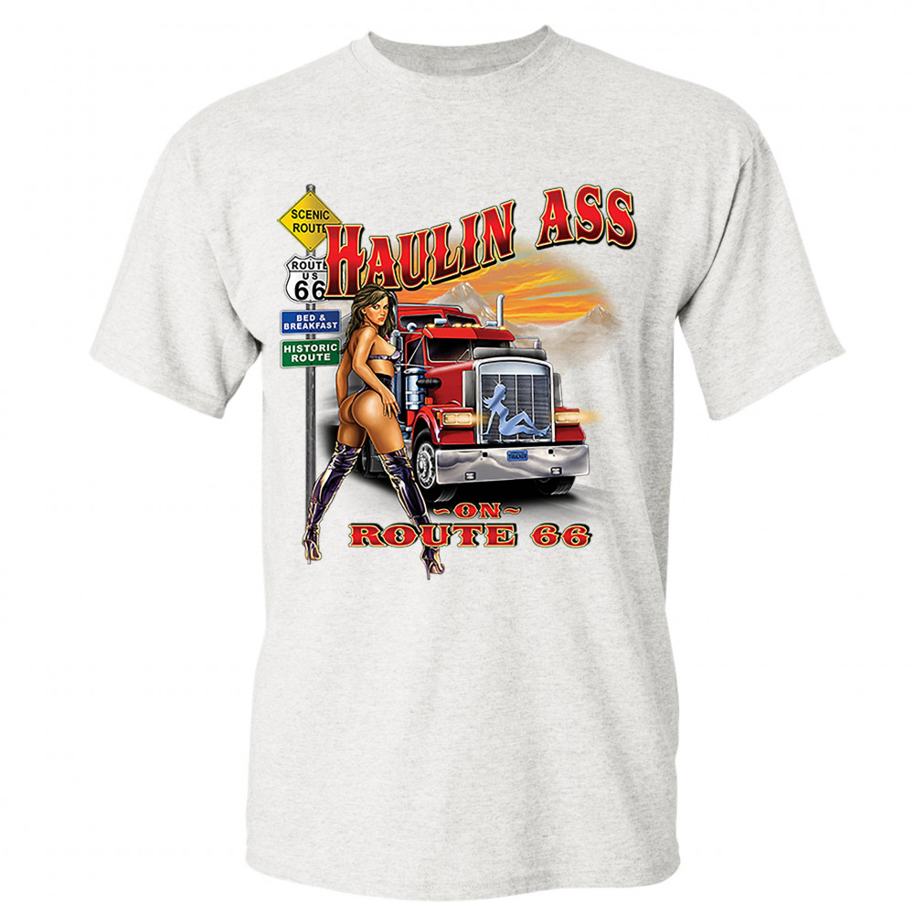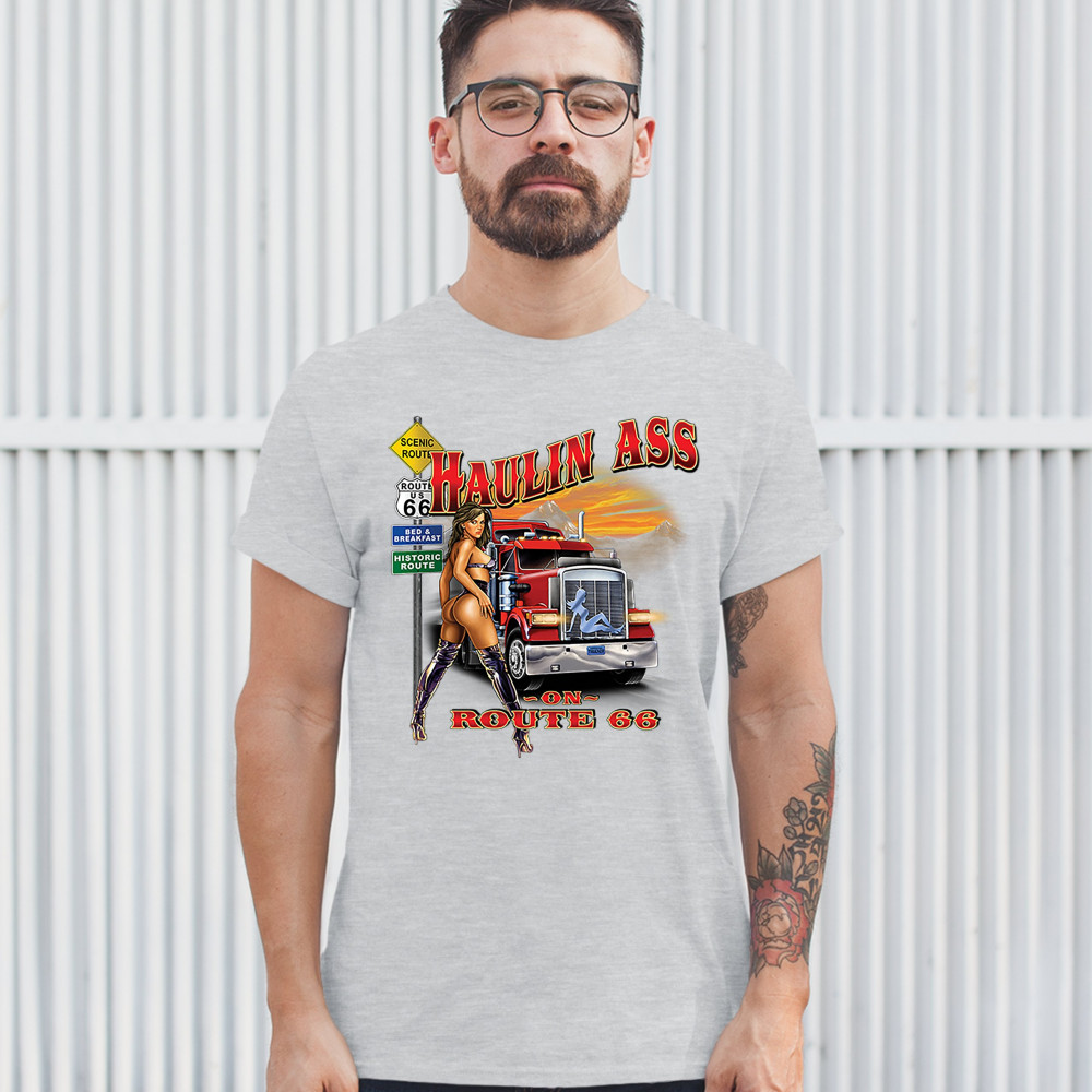 HAULIN ASS ON ROUTE 66 t-shirt historic route 66 trucker teamster men's tee ash gray