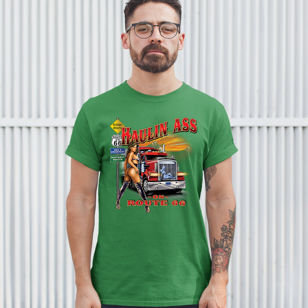 A print featuring a scantily-clad brunette woman standing by a Route 66 sign. A classic truck is passing by and the print says: "Haulin Ass on Route 66". A great choice for anyone who appreciates beautiful women and is a fan of the legendary Mother Road.