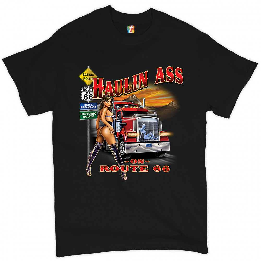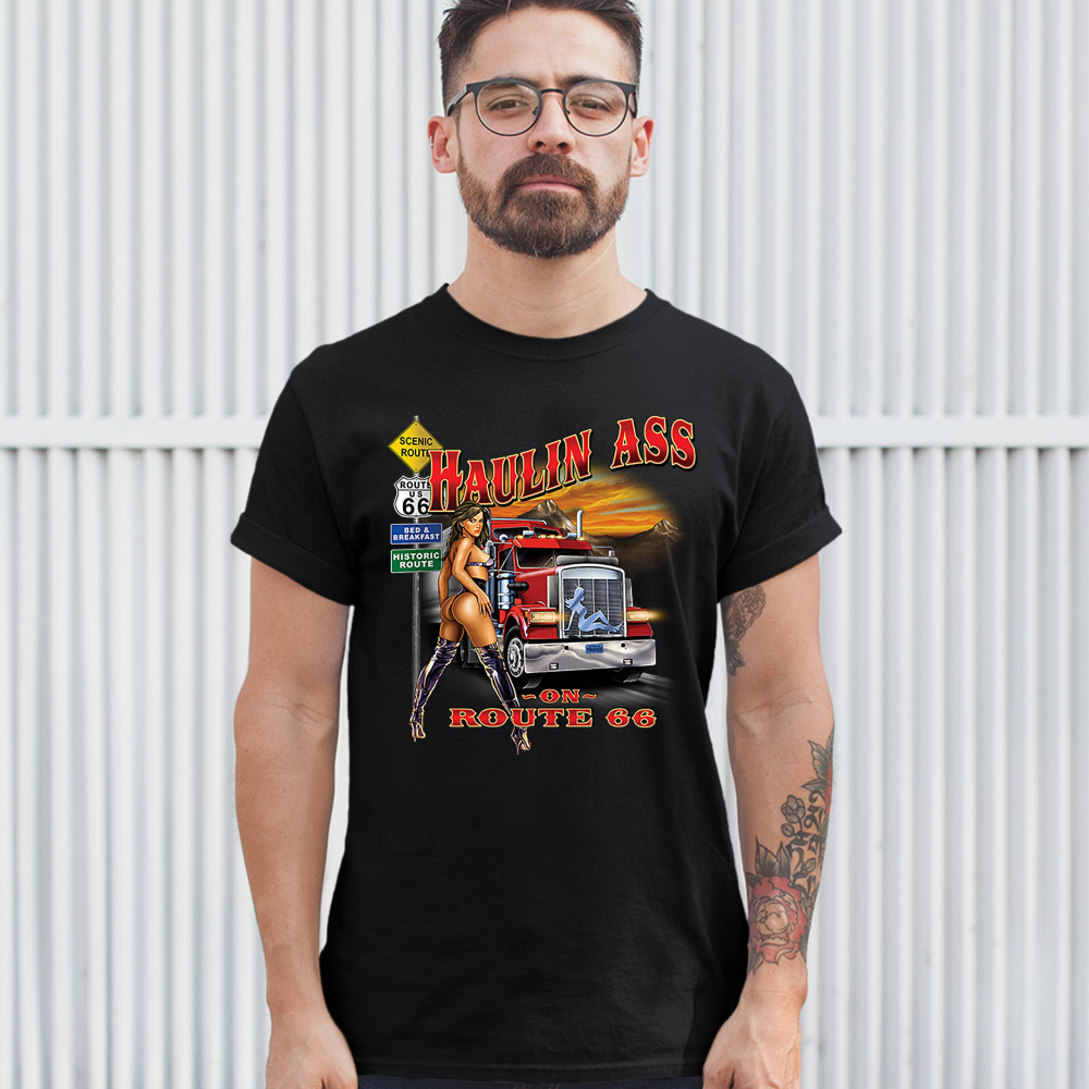 A print featuring a scantily-clad brunette woman standing by a Route 66 sign. A classic truck is passing by and the print says: "Haulin Ass on Route 66". A great choice for anyone who appreciates beautiful women and is a fan of the legendary Mother Road.