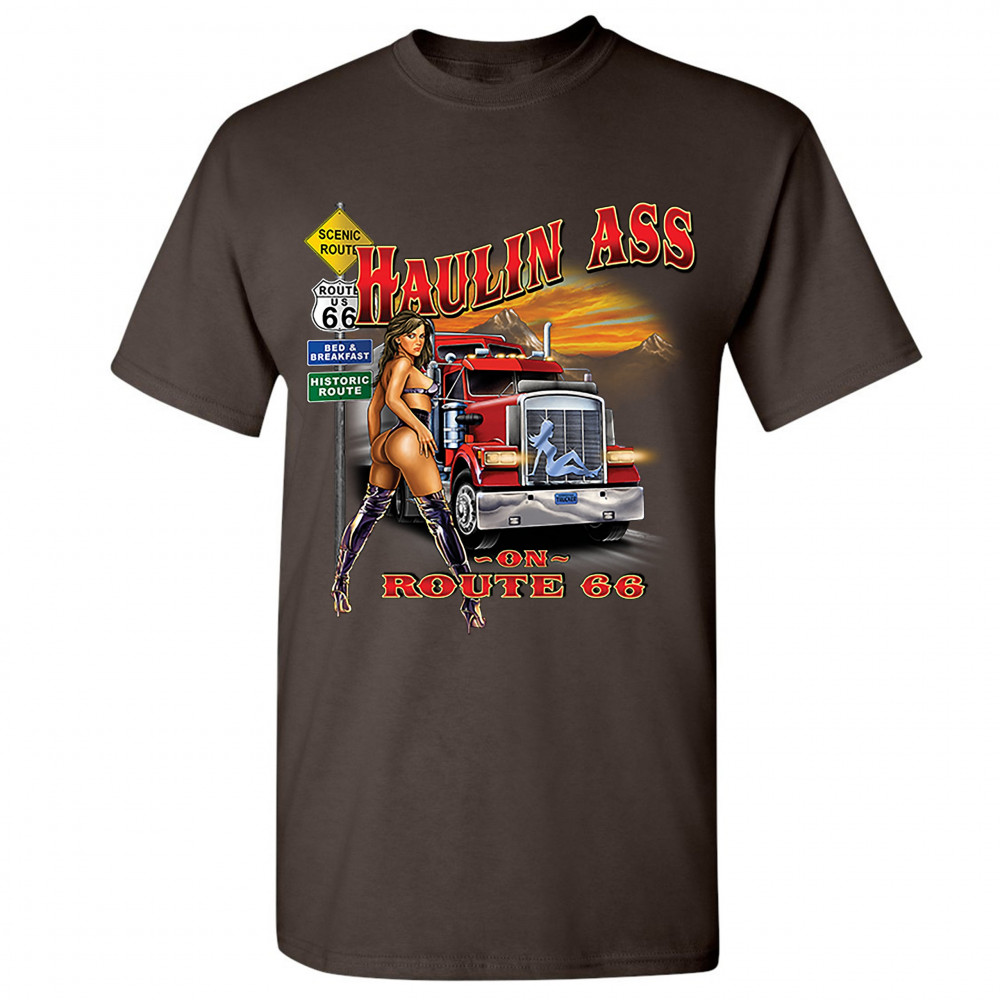 A print featuring a scantily-clad brunette woman standing by a Route 66 sign. A classic truck is passing by and the print says: "Haulin Ass on Route 66". A great choice for anyone who appreciates beautiful women and is a fan of the legendary Mother Road.