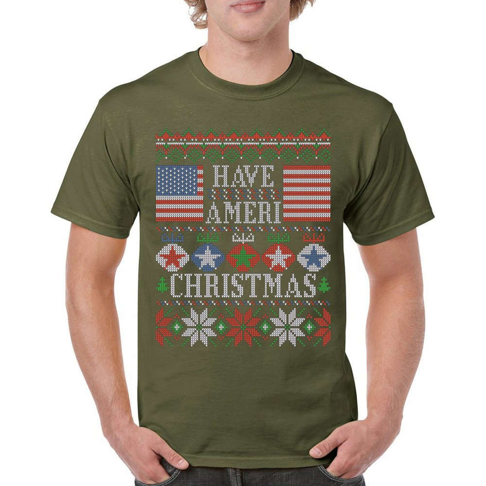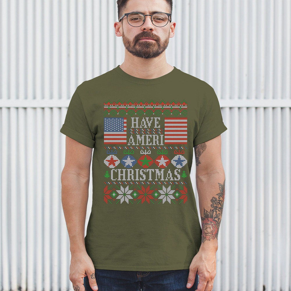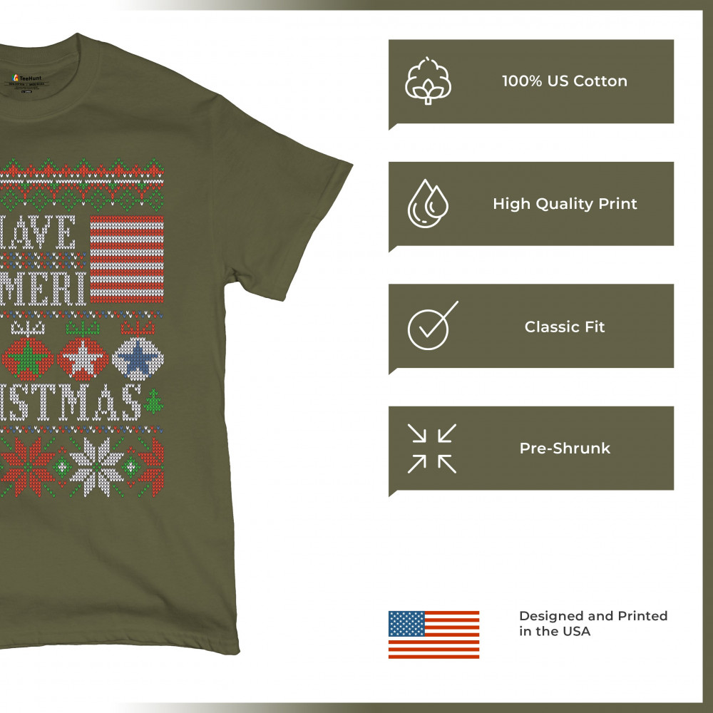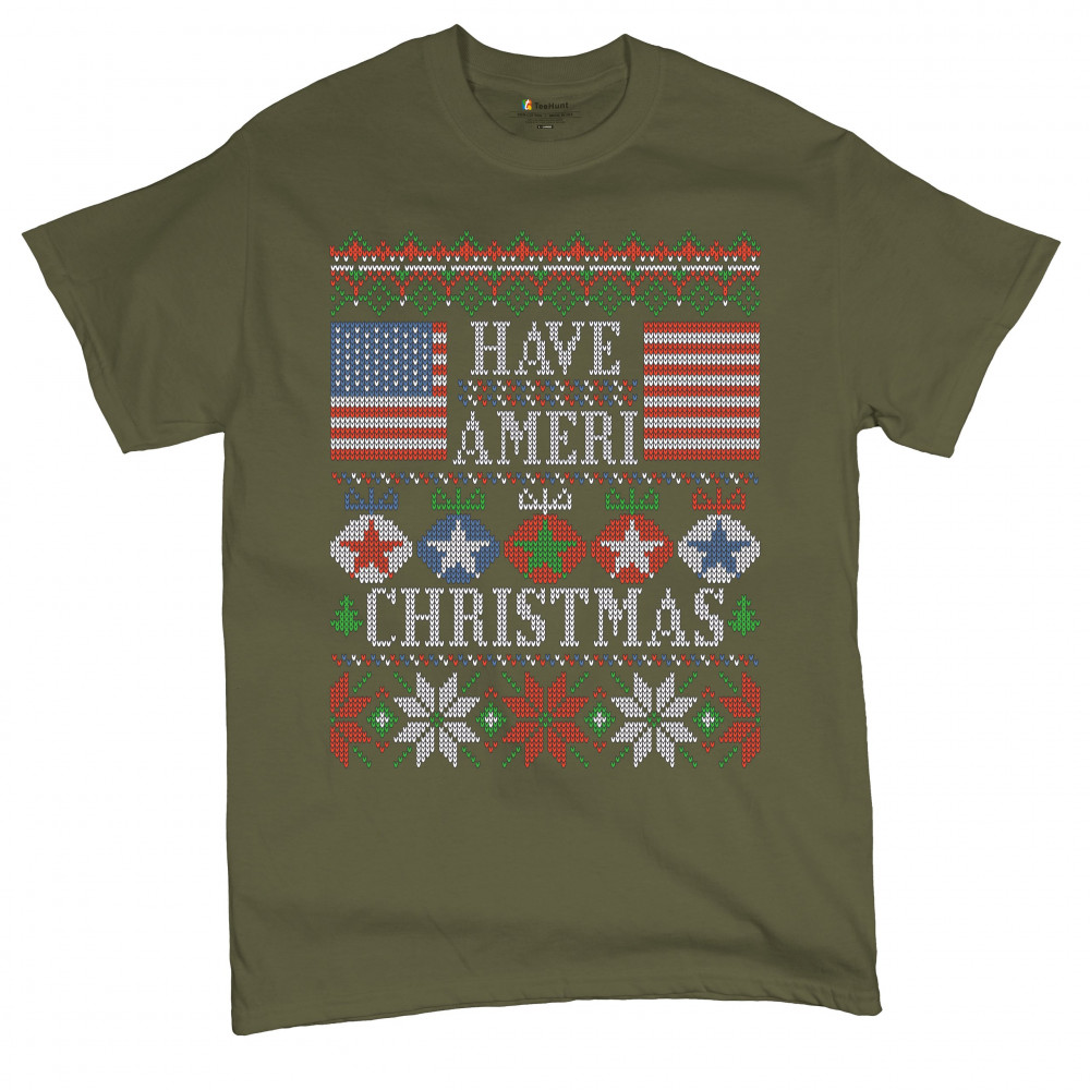 HAVE AMERI CHRISTMAS t-shirt american flag ugly sweater patriotic men's tee military green
