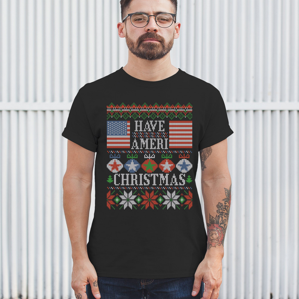 HAVE AMERI CHRISTMAS t-shirt american flag ugly sweater patriotic men's tee black