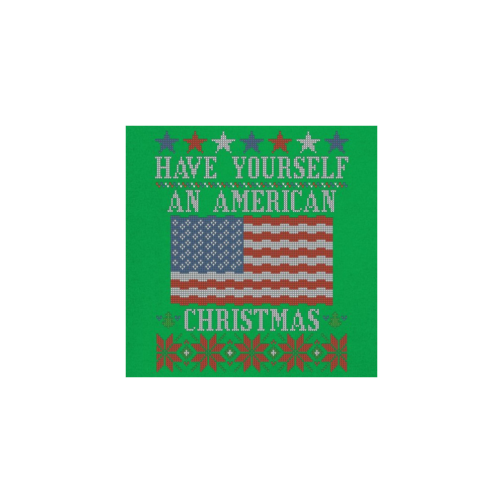 A print saying: "Have Yourself an American Christmas" and featuring an American flag. The print is designed as an ugly sweater. Amazing choice to express your patriotism while celebrating Christmas.