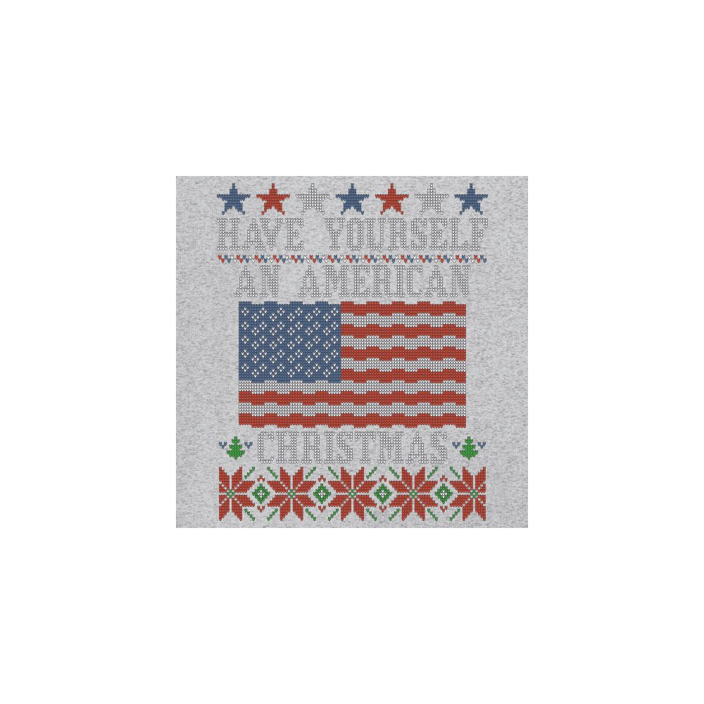 A print saying: "Have Yourself an American Christmas" and featuring an American flag. The print is designed as an ugly sweater. Amazing choice to express your patriotism while celebrating Christmas.