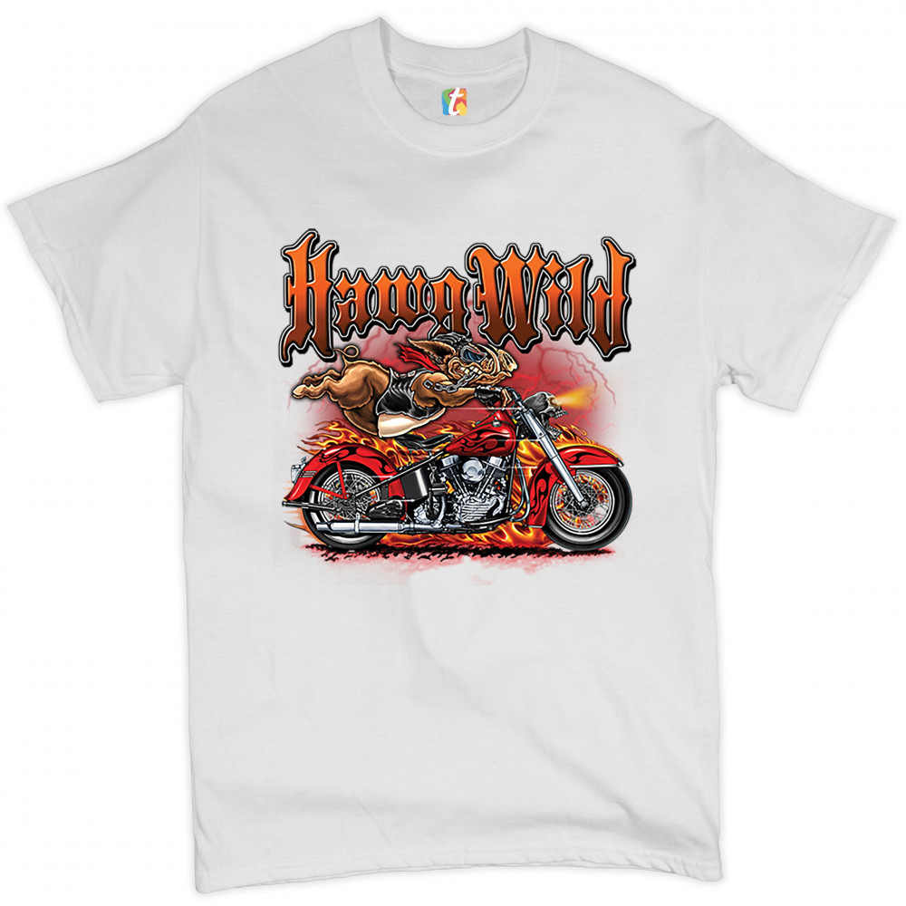 A print featuring a warthog biker holding onto the handlebars of a motorcycle riding so fast, it's body is lifted from the bike. The bike is on fire and there a lightning strikes in the background. The print says: "Hawg Wild". A great choice for a motorcy