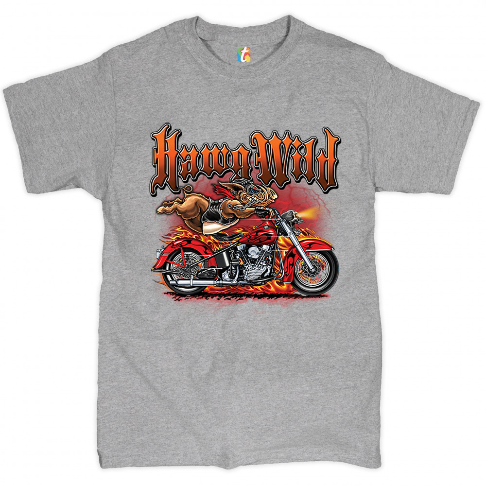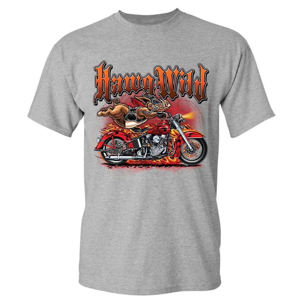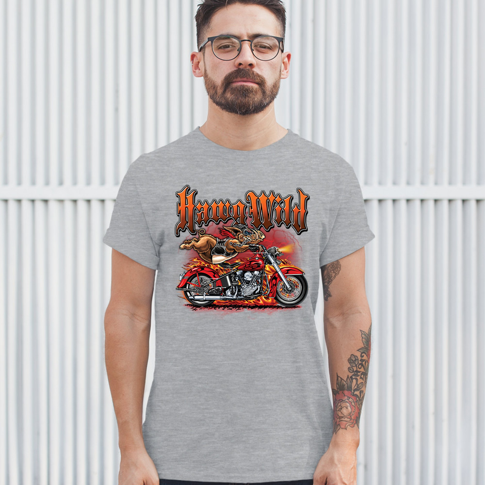 A print featuring a warthog biker holding onto the handlebars of a motorcycle riding so fast, it's body is lifted from the bike. The bike is on fire and there a lightning strikes in the background. The print says: "Hawg Wild". A great choice for a motorcy