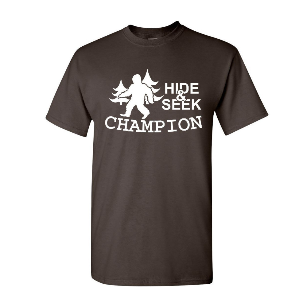 HIDE AND SEEK CHAMPION t-shirt bigfoot yeti funny humor mens tee shirt brown