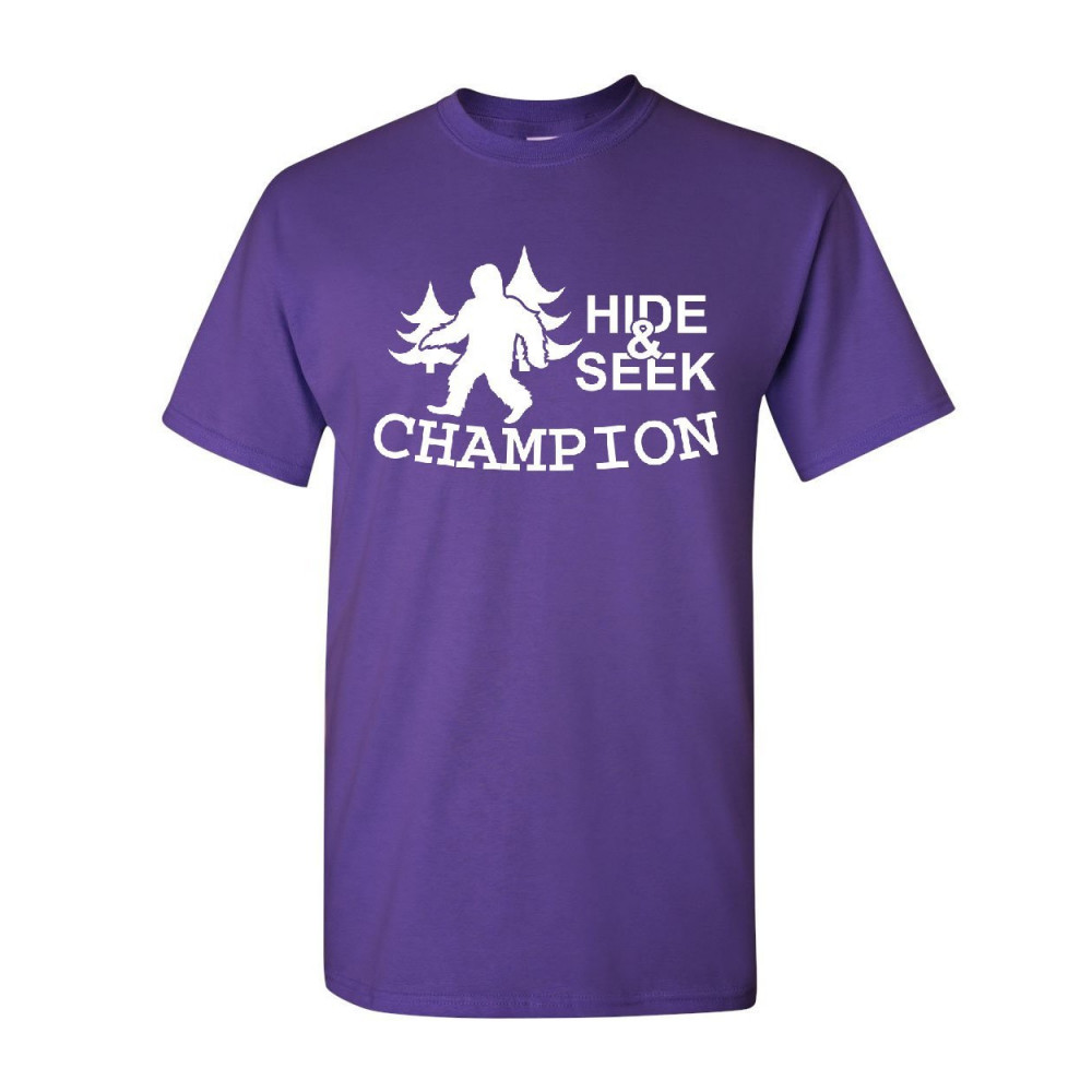 HIDE AND SEEK CHAMPION t-shirt bigfoot yeti funny humor mens tee shirt purple