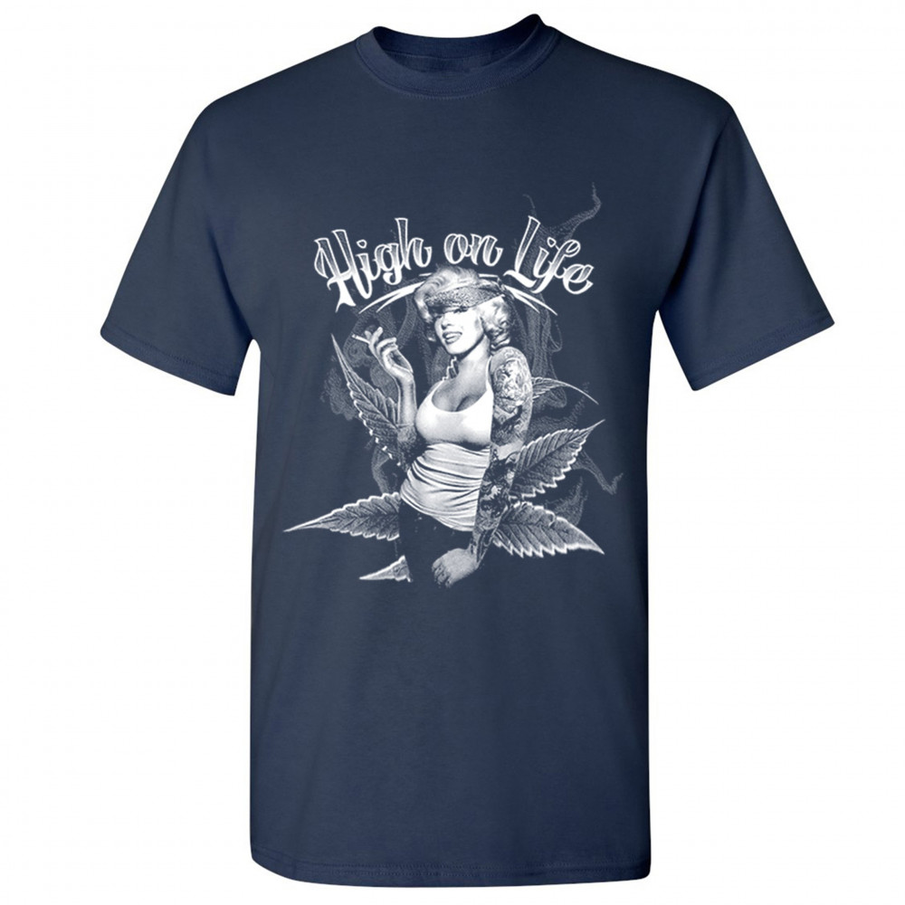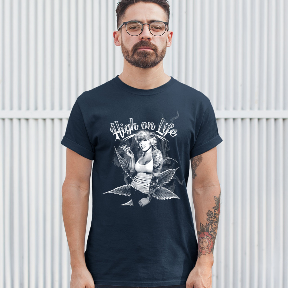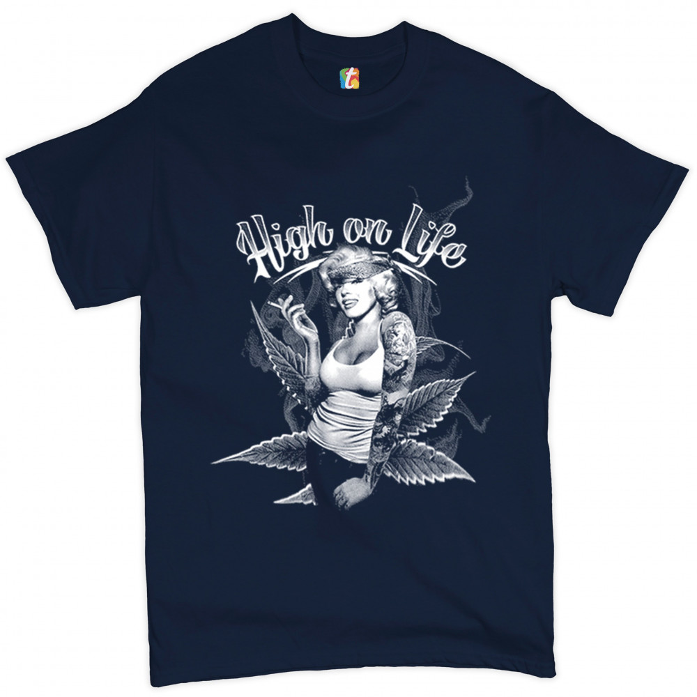 HIGH ON LIFE t-shirt marilyn monroe holding a joint 420 pop culture men's tee navy blue