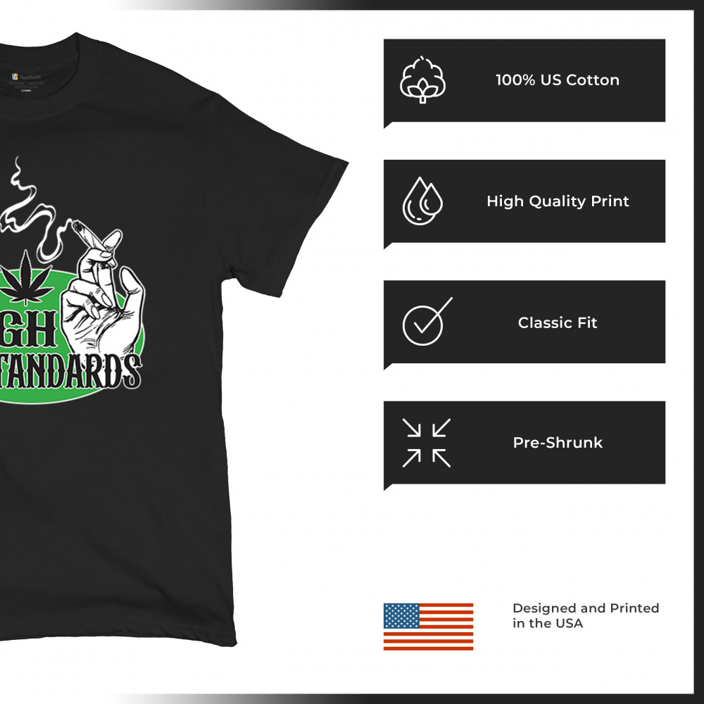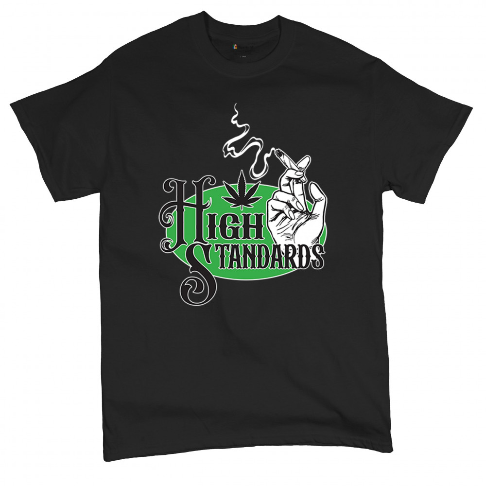 High Standards weed design with blunt humor and stoner pride. Features joint, cannabis leaf, pothead attitude, and classy chillout vibes.
