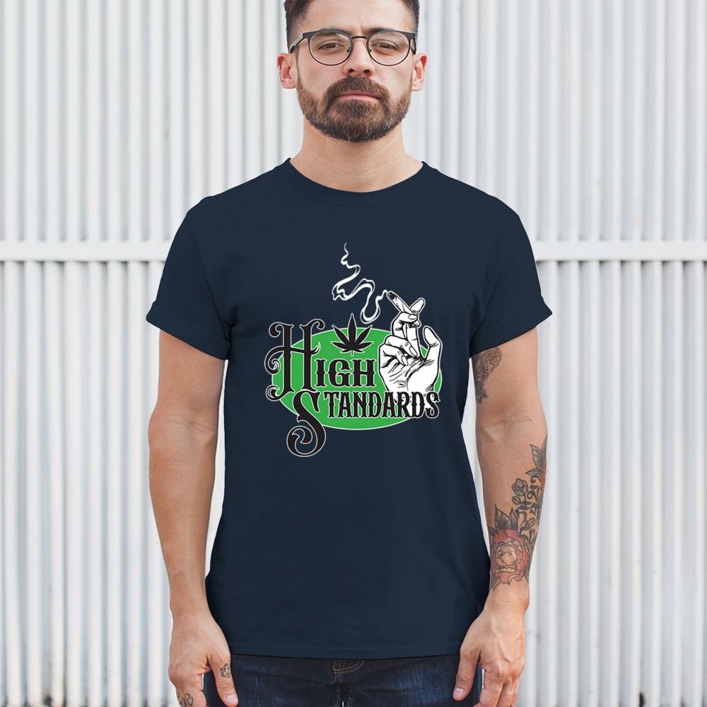High Standards weed design with blunt humor and stoner pride. Features joint, cannabis leaf, pothead attitude, and classy chillout vibes.