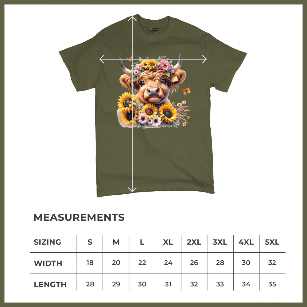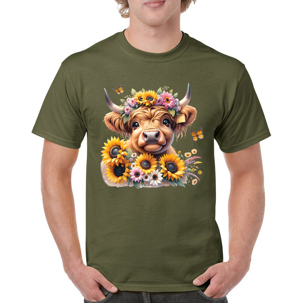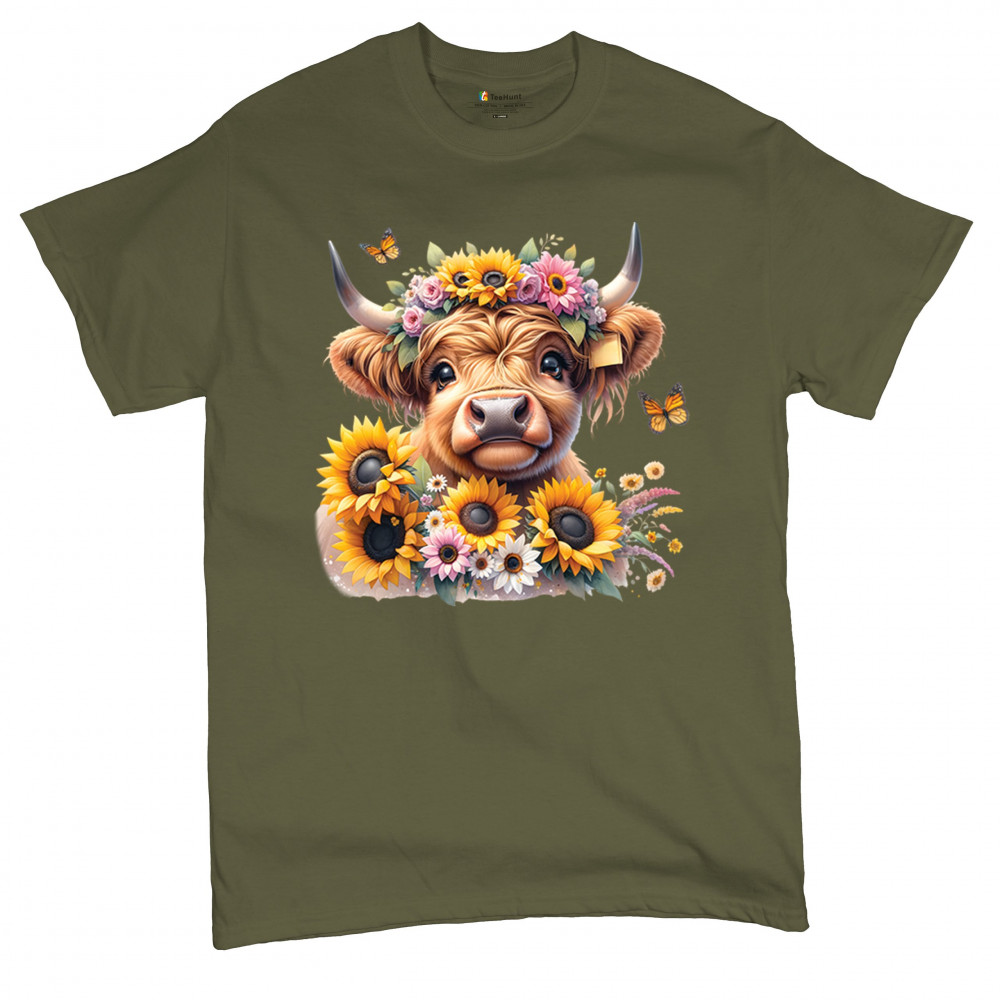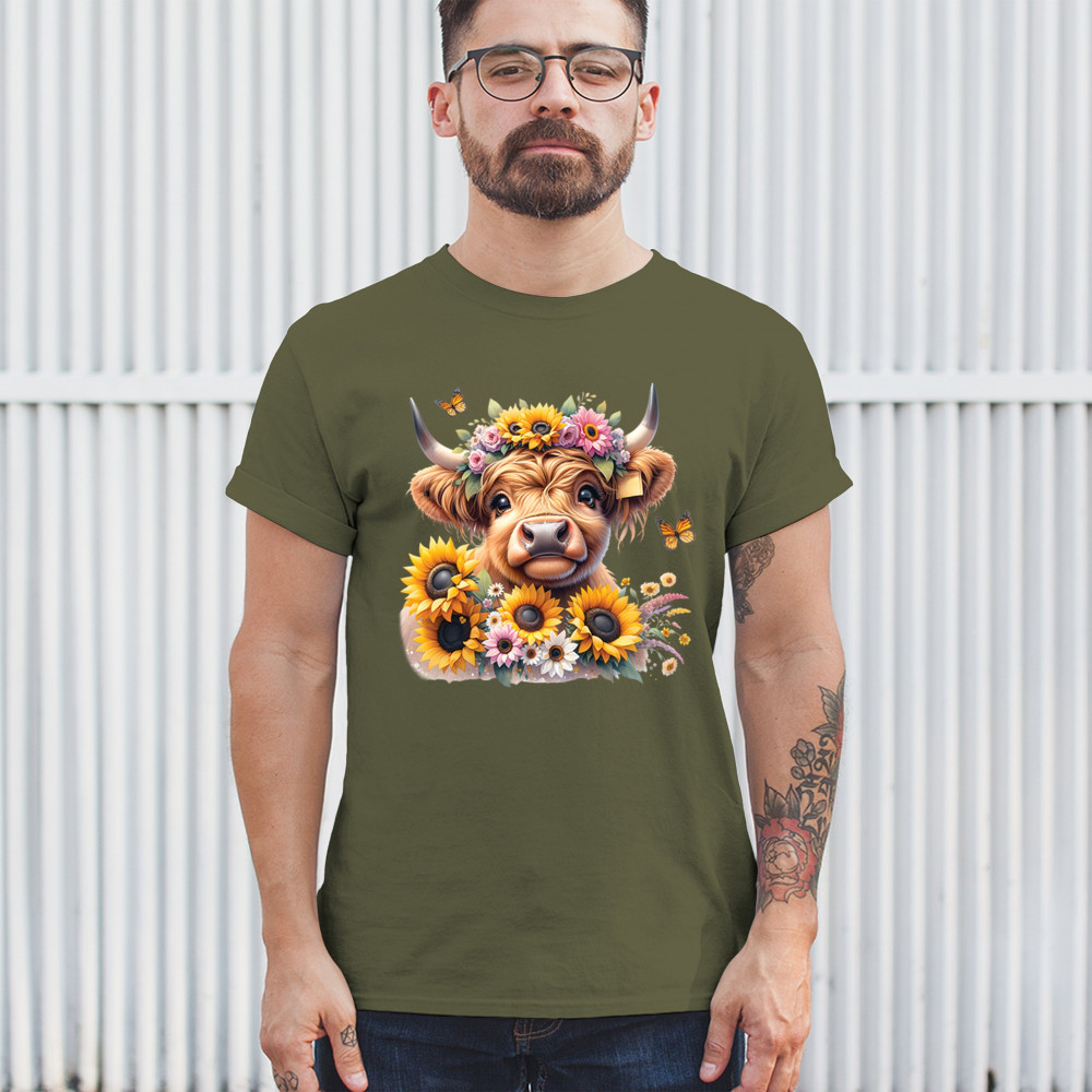 Highland Cow floral design with sunflowers and daisies, rustic farmhouse cow style, western ranch boho charm, and cozy country farmhouse shirt vibes.