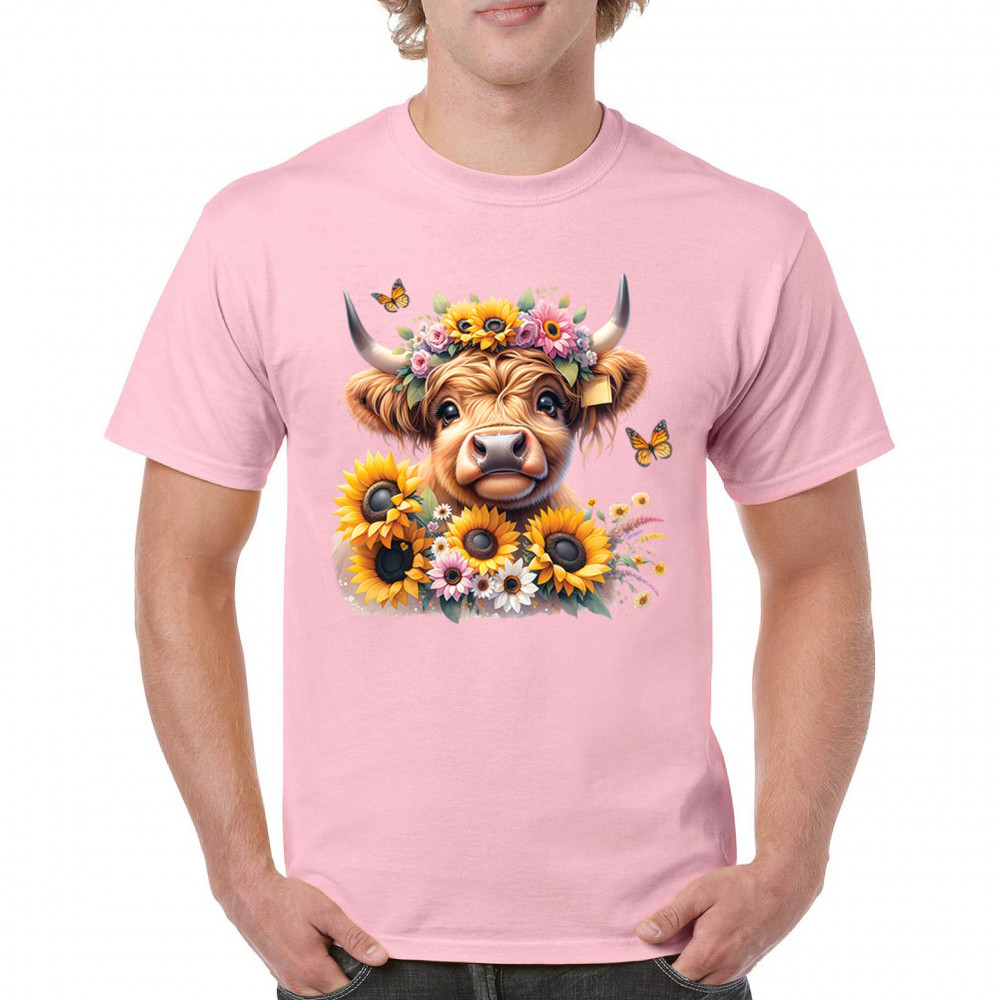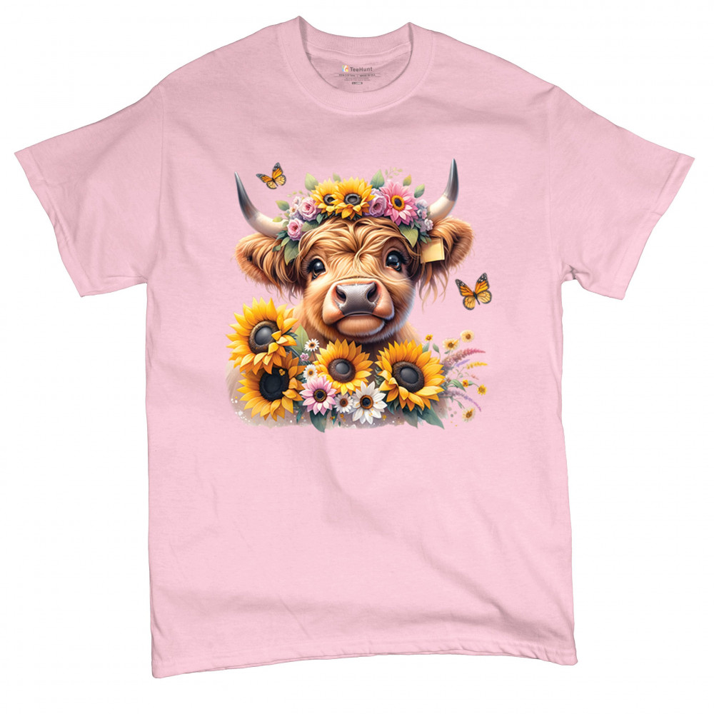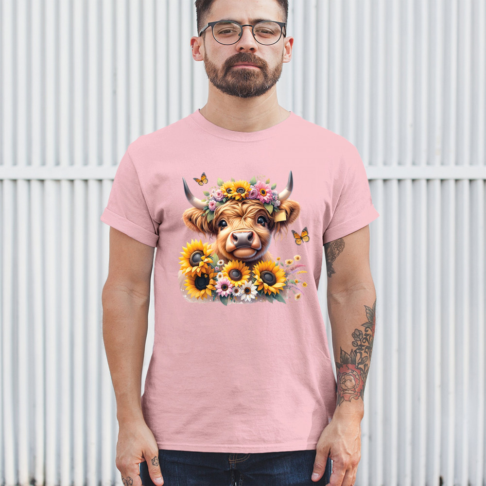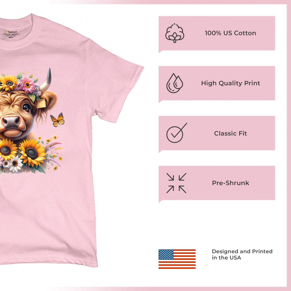 Highland Cow floral design with sunflowers and daisies, rustic farmhouse cow style, western ranch boho charm, and cozy country farmhouse shirt vibes.