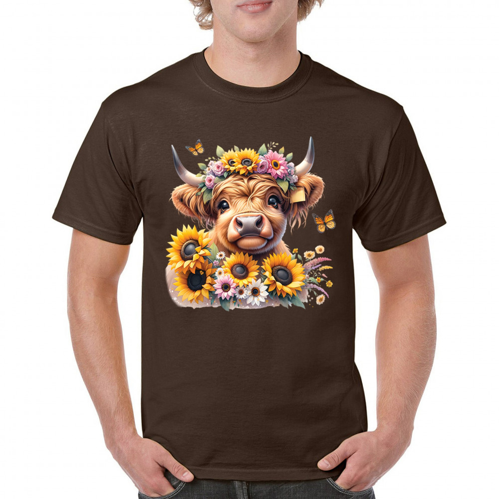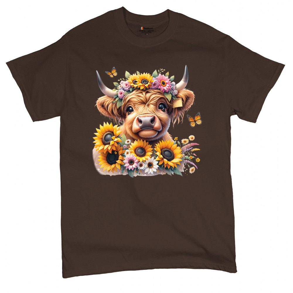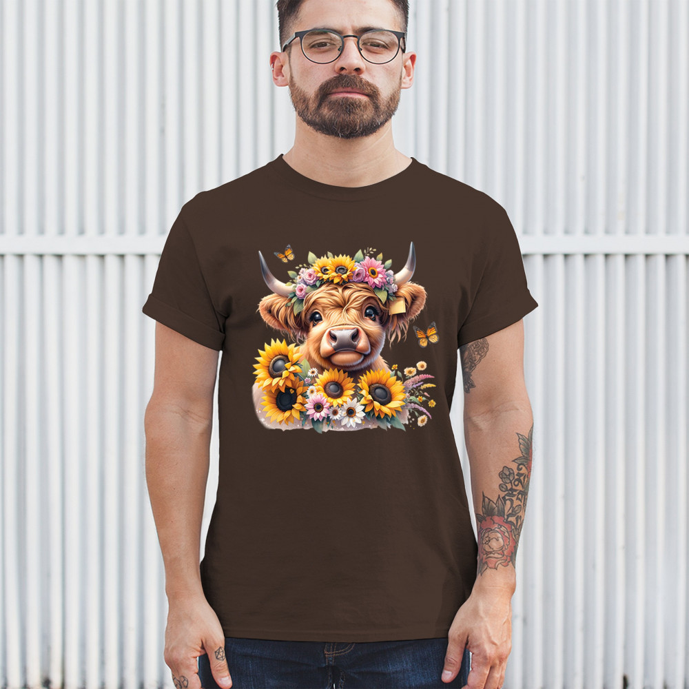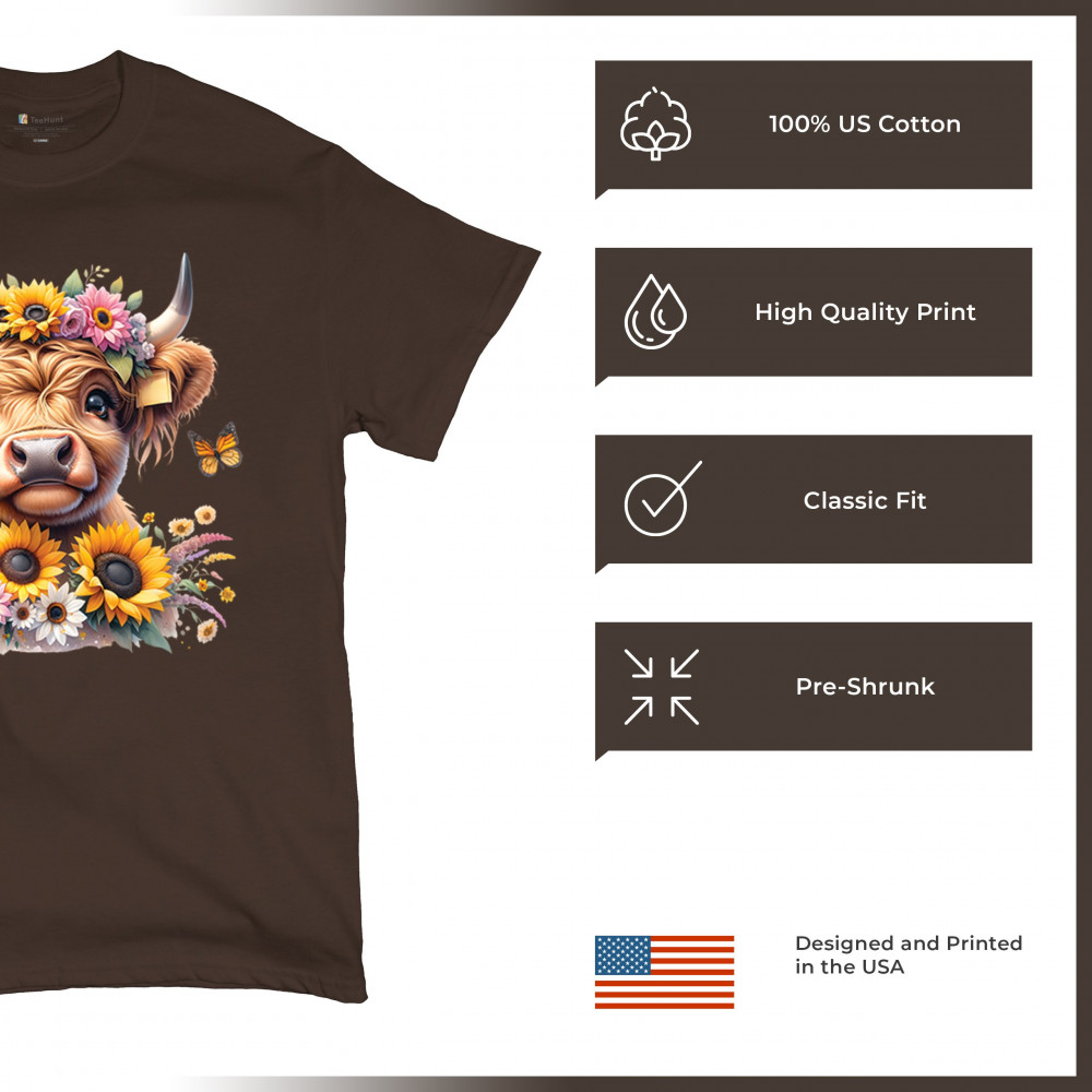 Highland Cow floral design with sunflowers and daisies, rustic farmhouse cow style, western ranch boho charm, and cozy country farmhouse shirt vibes.