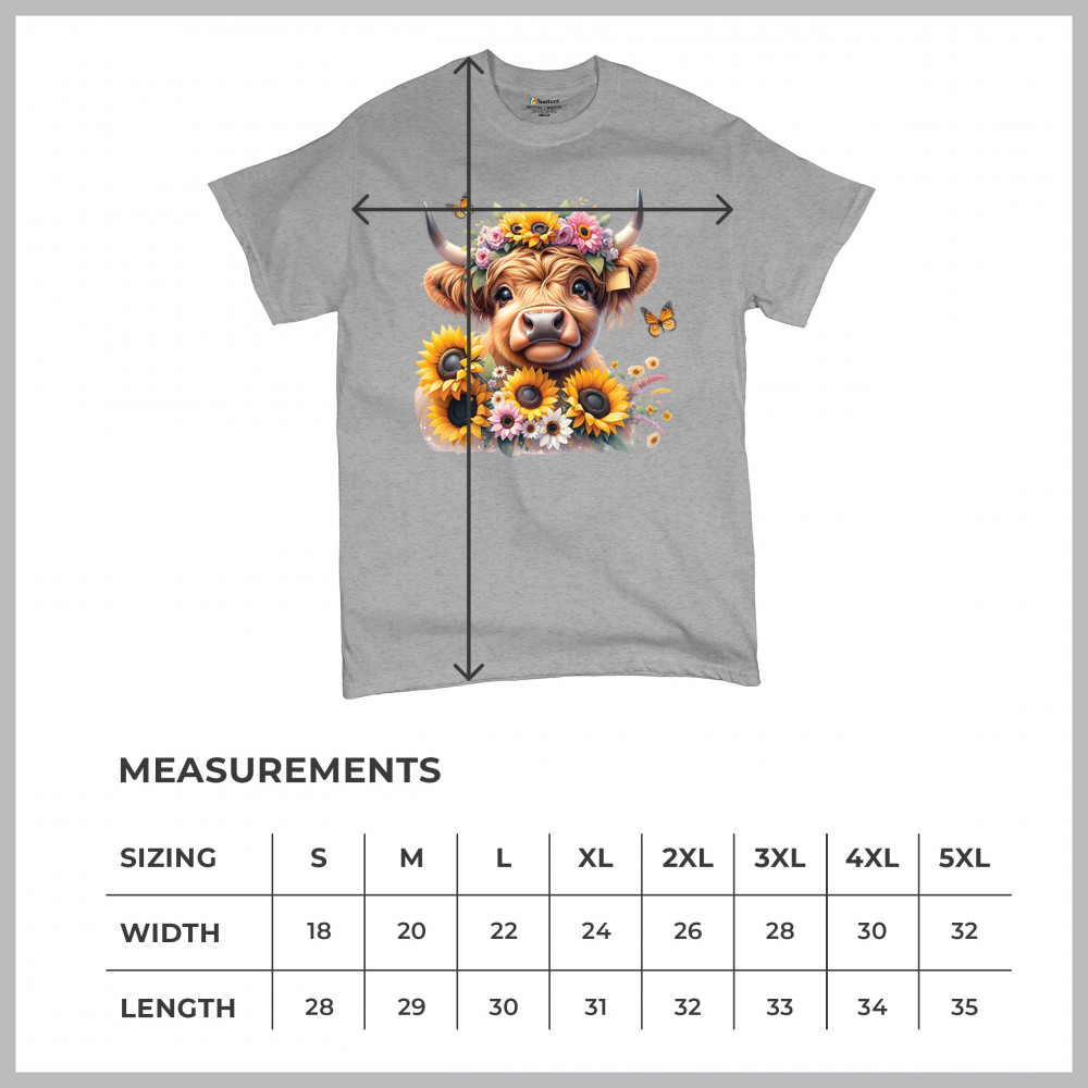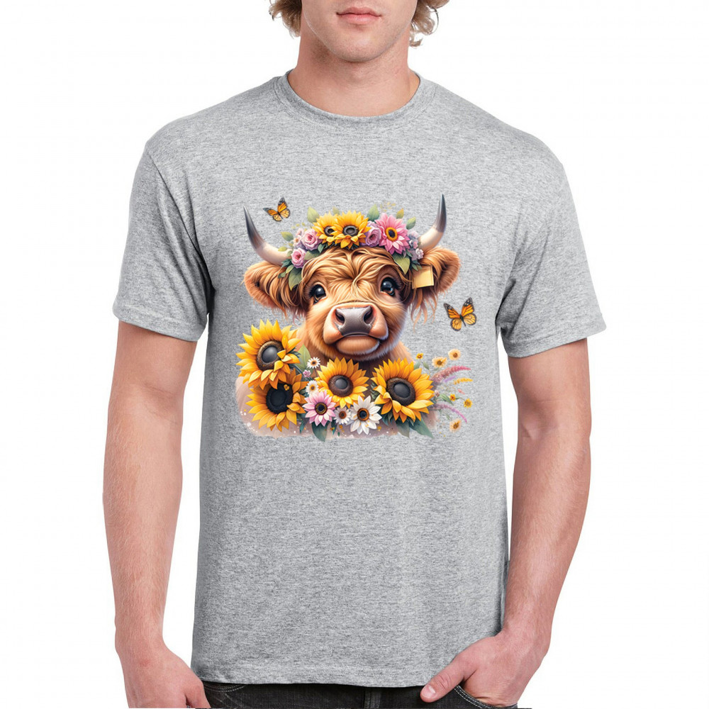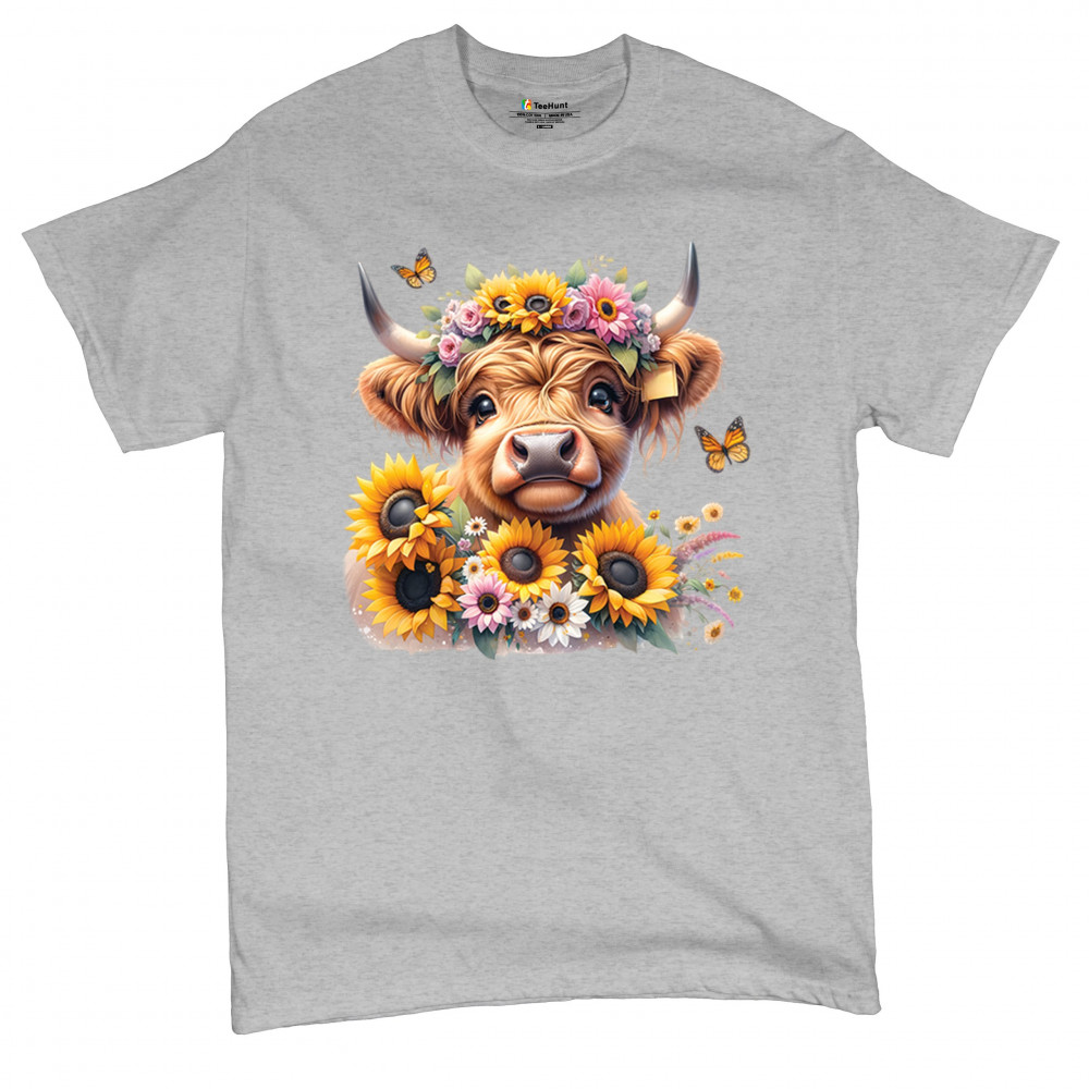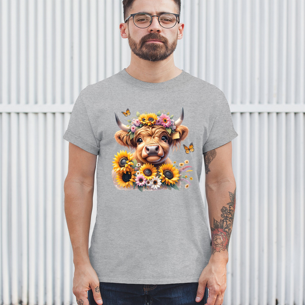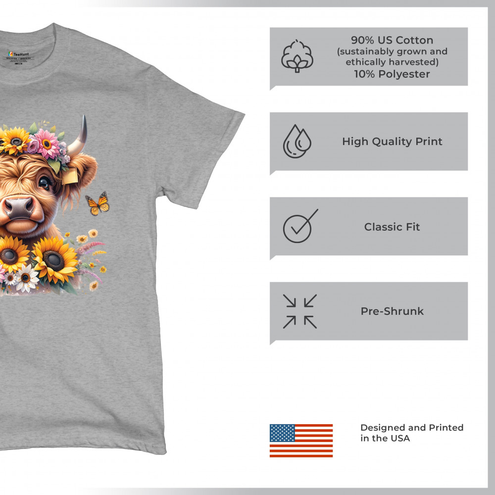 Highland Cow floral design with sunflowers and daisies, rustic farmhouse cow style, western ranch boho charm, and cozy country farmhouse shirt vibes.