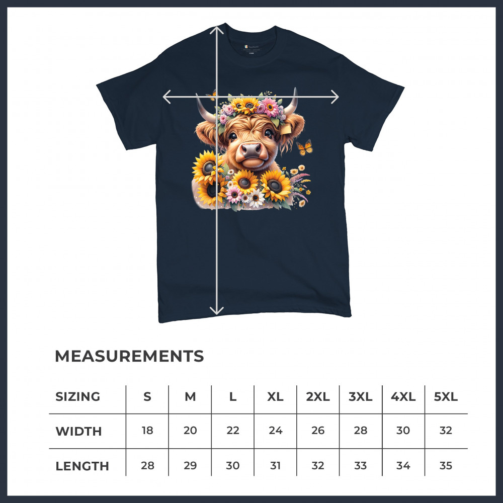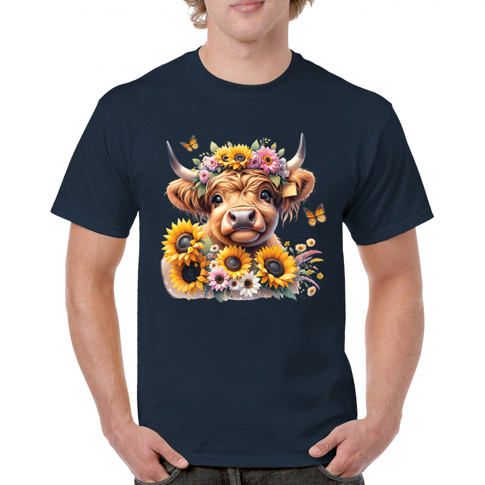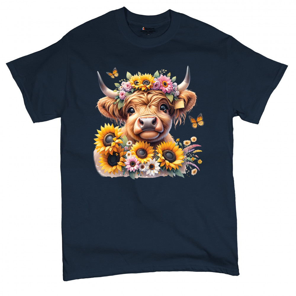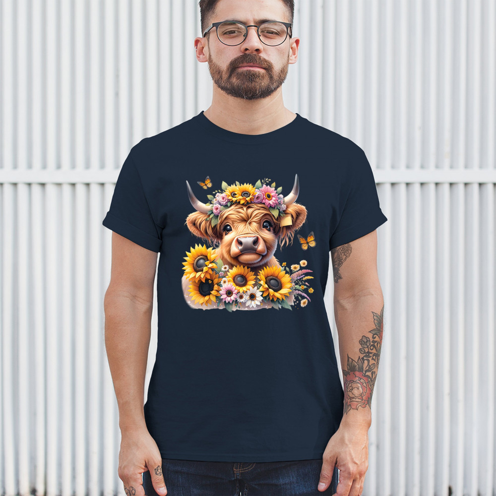 Highland Cow floral design with sunflowers and daisies, rustic farmhouse cow style, western ranch boho charm, and cozy country farmhouse shirt vibes.