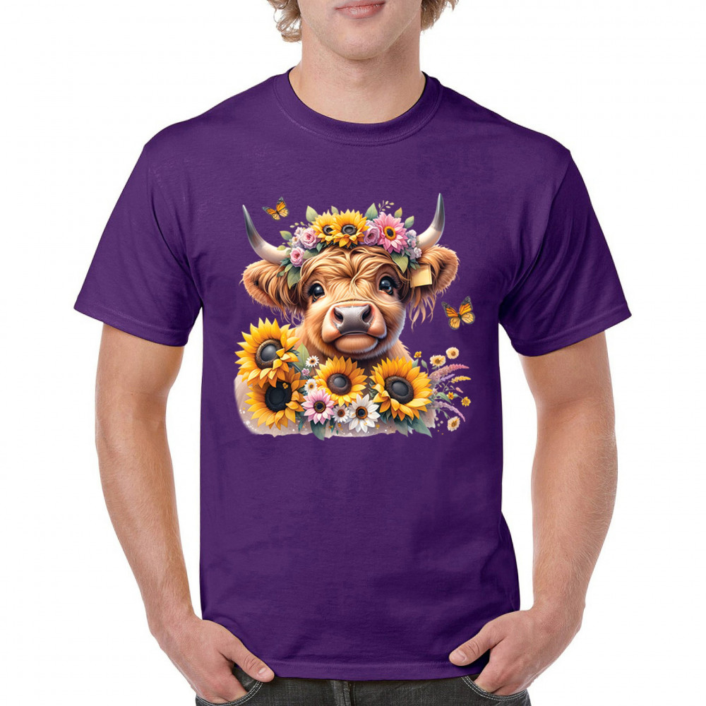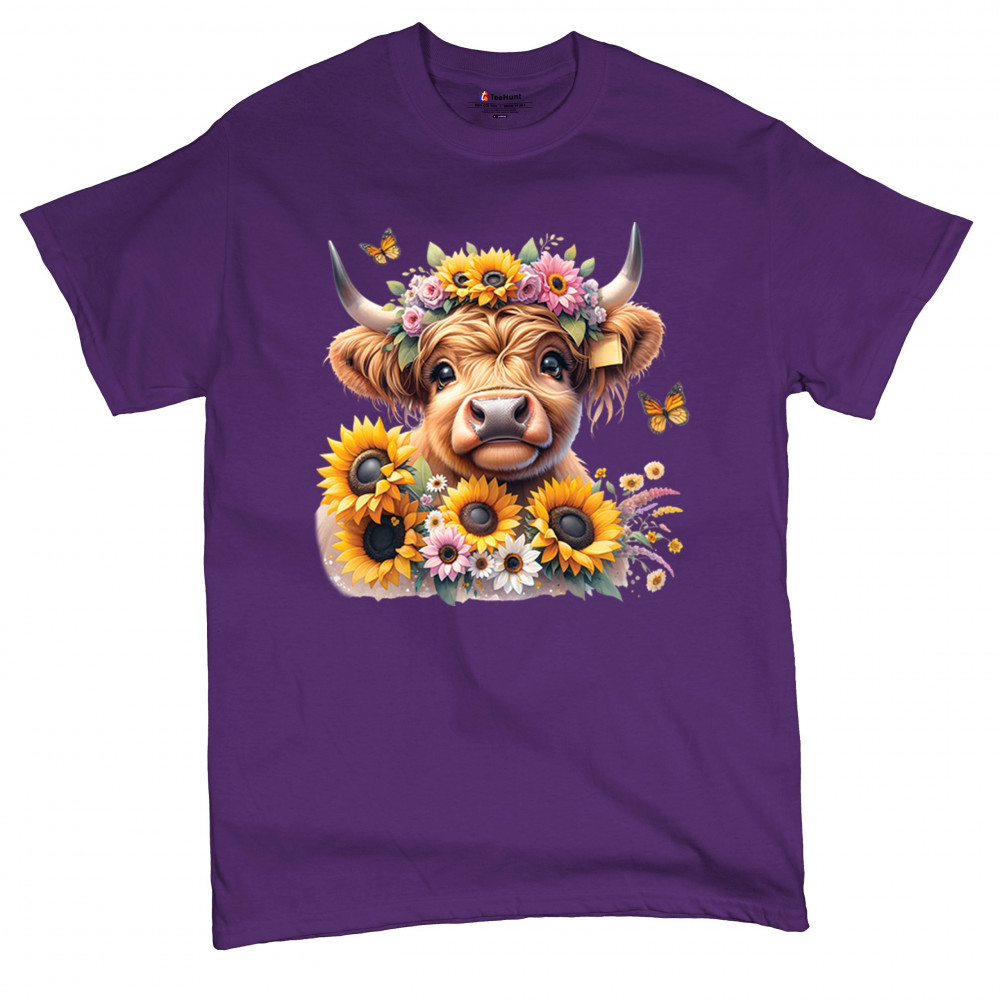 Highland Cow floral design with sunflowers and daisies, rustic farmhouse cow style, western ranch boho charm, and cozy country farmhouse shirt vibes.