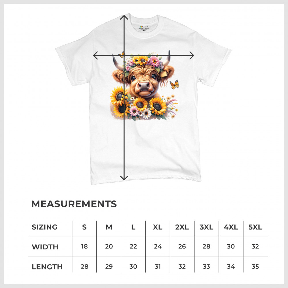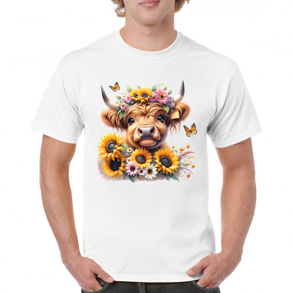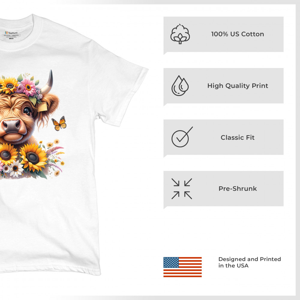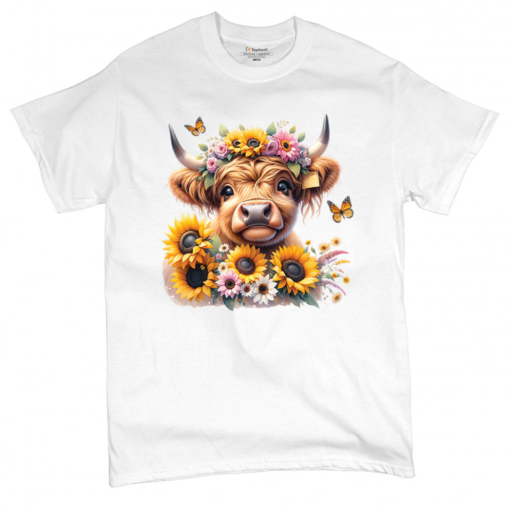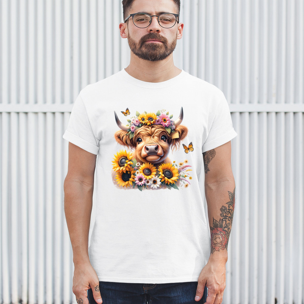 Highland Cow floral design with sunflowers and daisies, rustic farmhouse cow style, western ranch boho charm, and cozy country farmhouse shirt vibes.