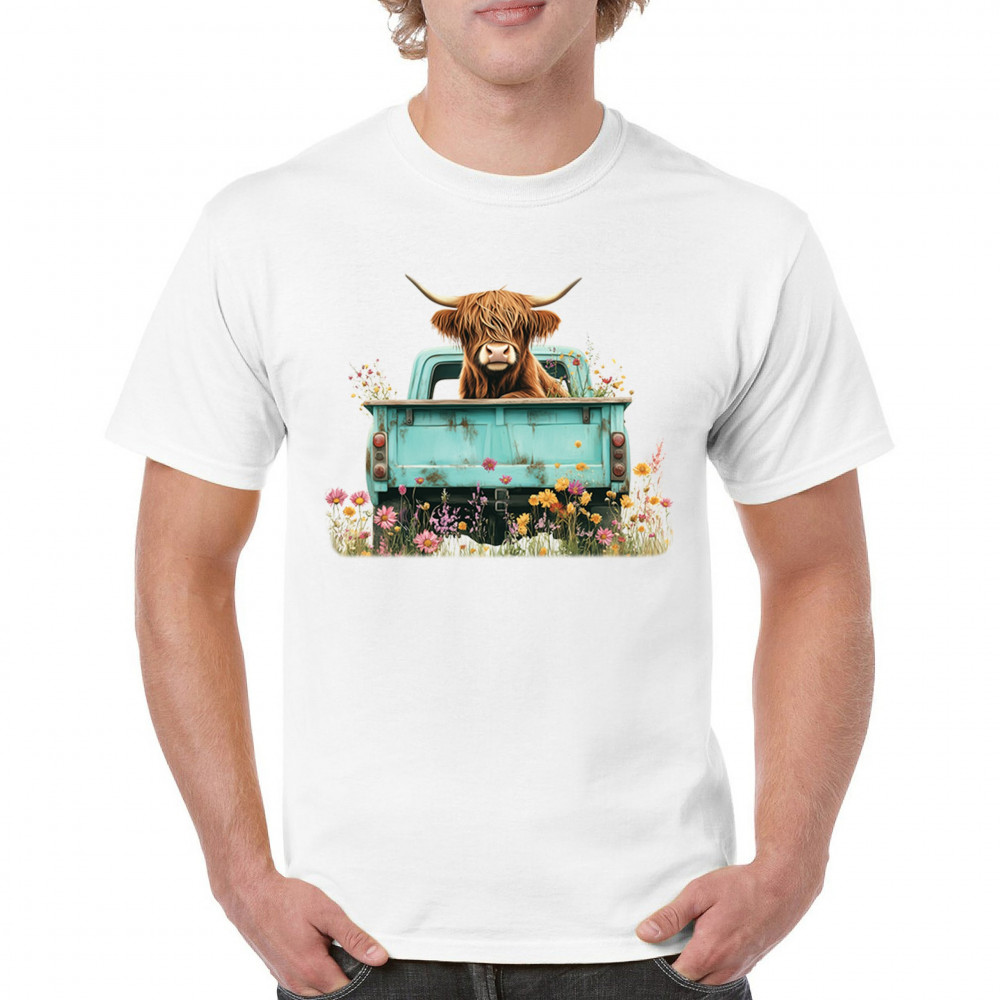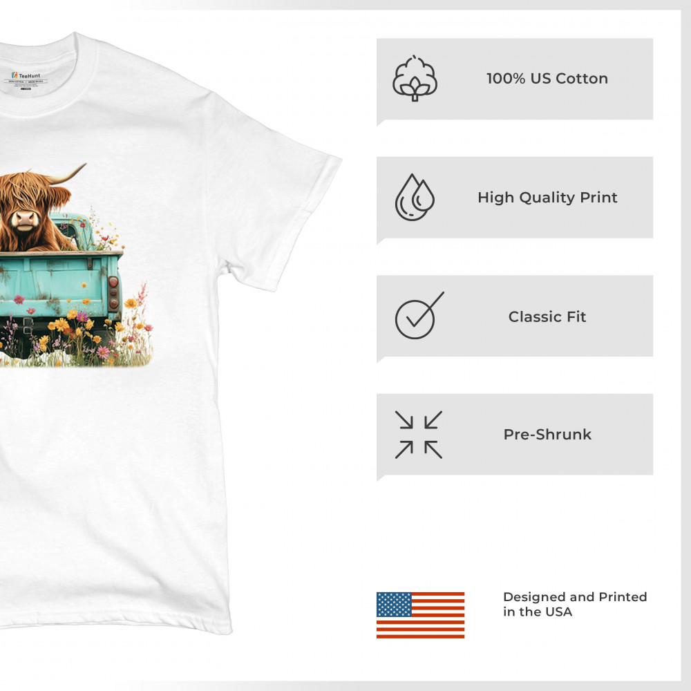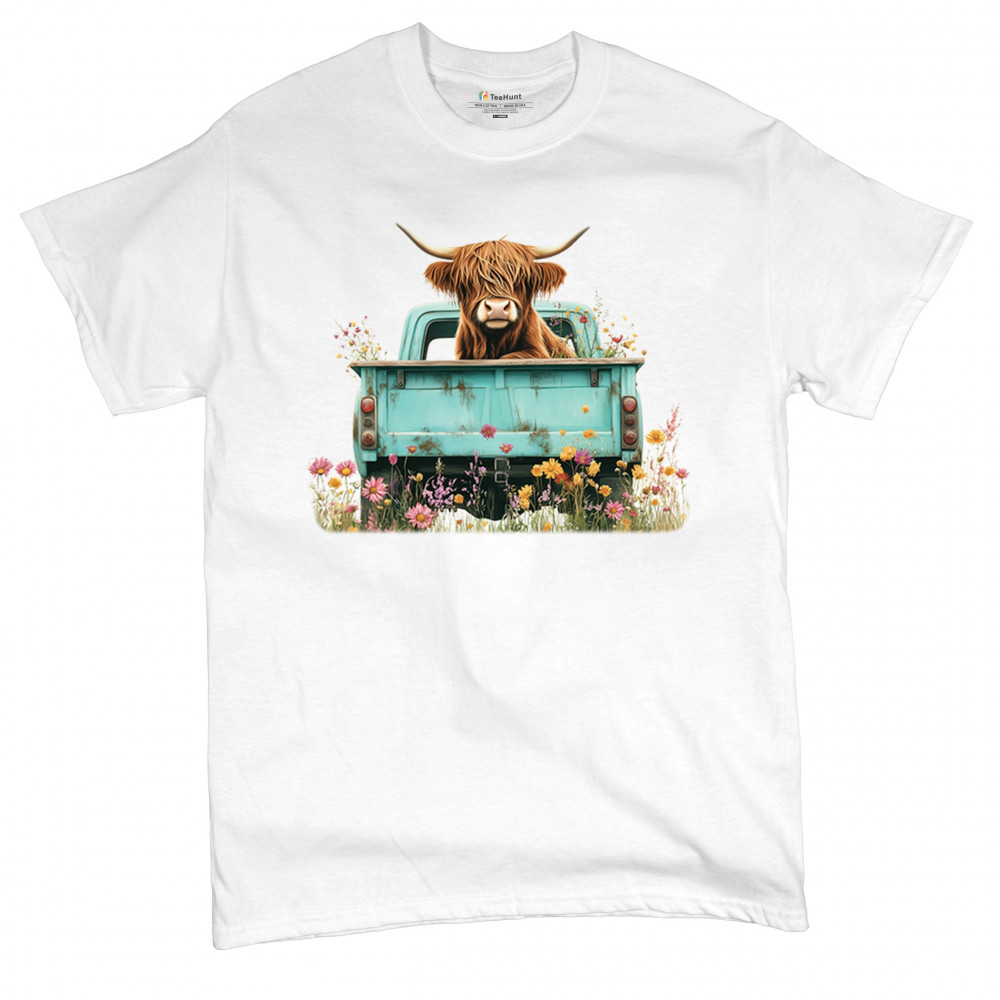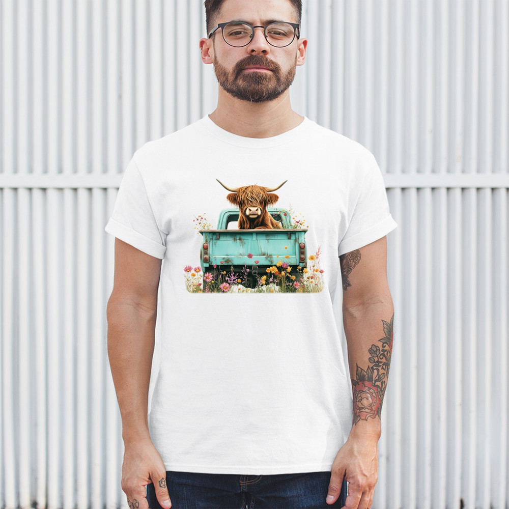 Celebrate rustic charm with this Highland Cow truck design, combining farmhouse floral truck art, boho ranch vibes, and country farmhouse shirt appeal. Perfect for cow lovers, barn style enthusiasts, and small town rural living. A vintage truck cow design that’s both cozy and stylish.