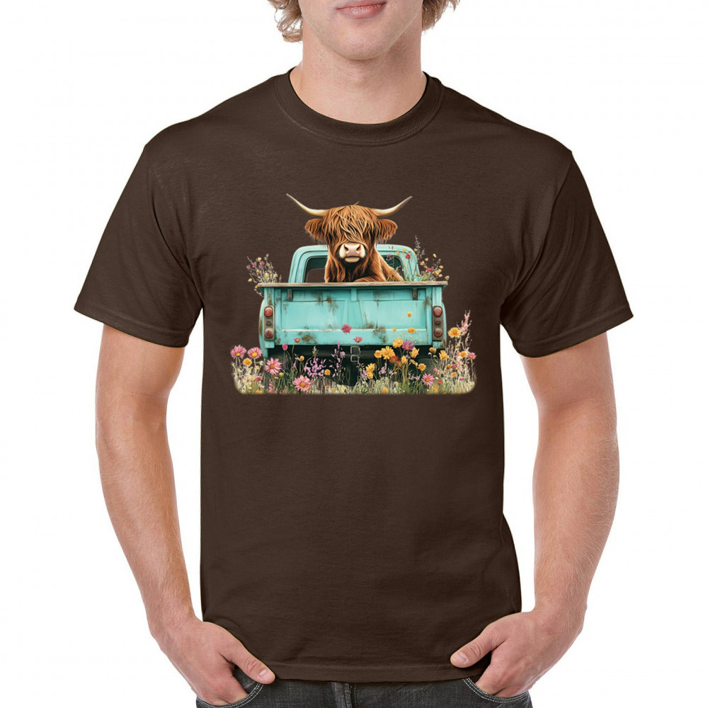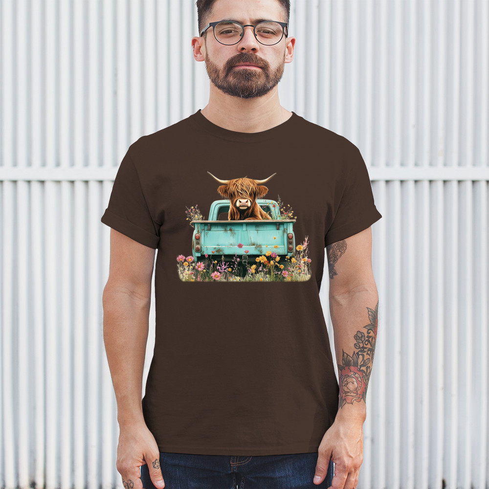 Celebrate rustic charm with this Highland Cow truck design, combining farmhouse floral truck art, boho ranch vibes, and country farmhouse shirt appeal. Perfect for cow lovers, barn style enthusiasts, and small town rural living. A vintage truck cow design that’s both cozy and stylish.