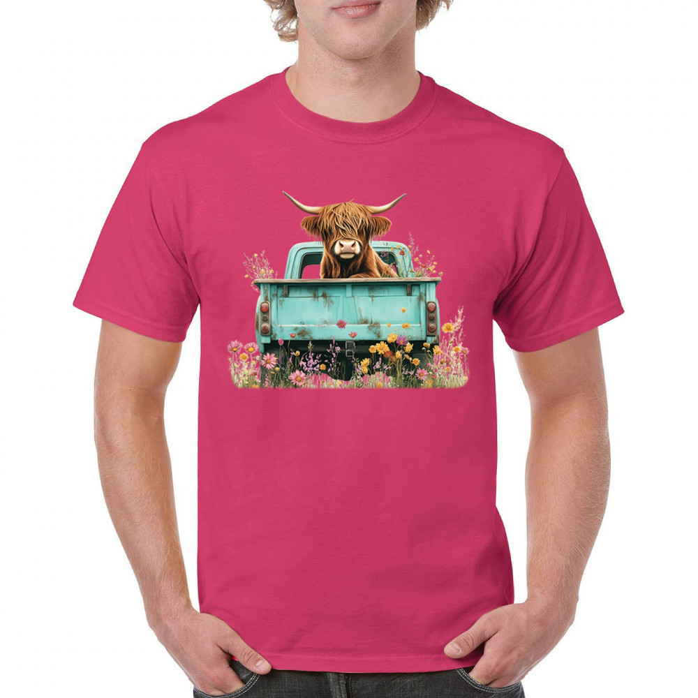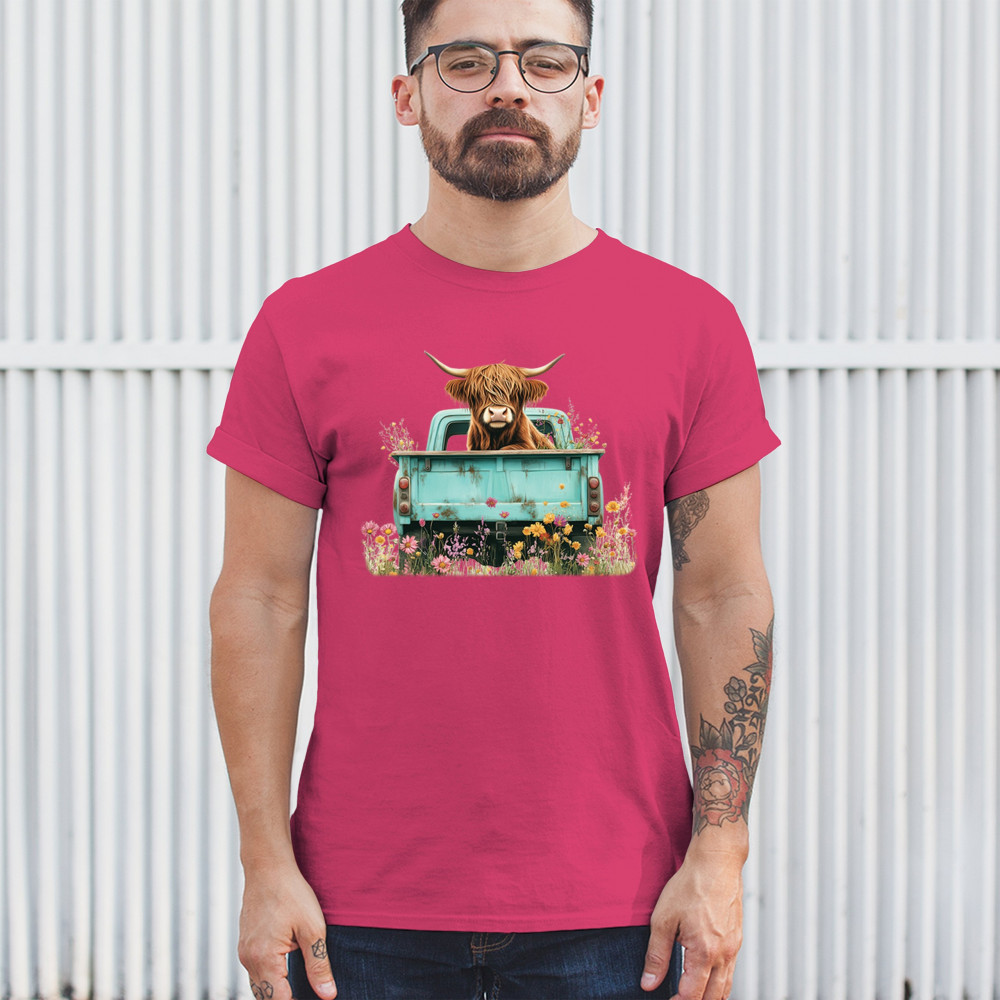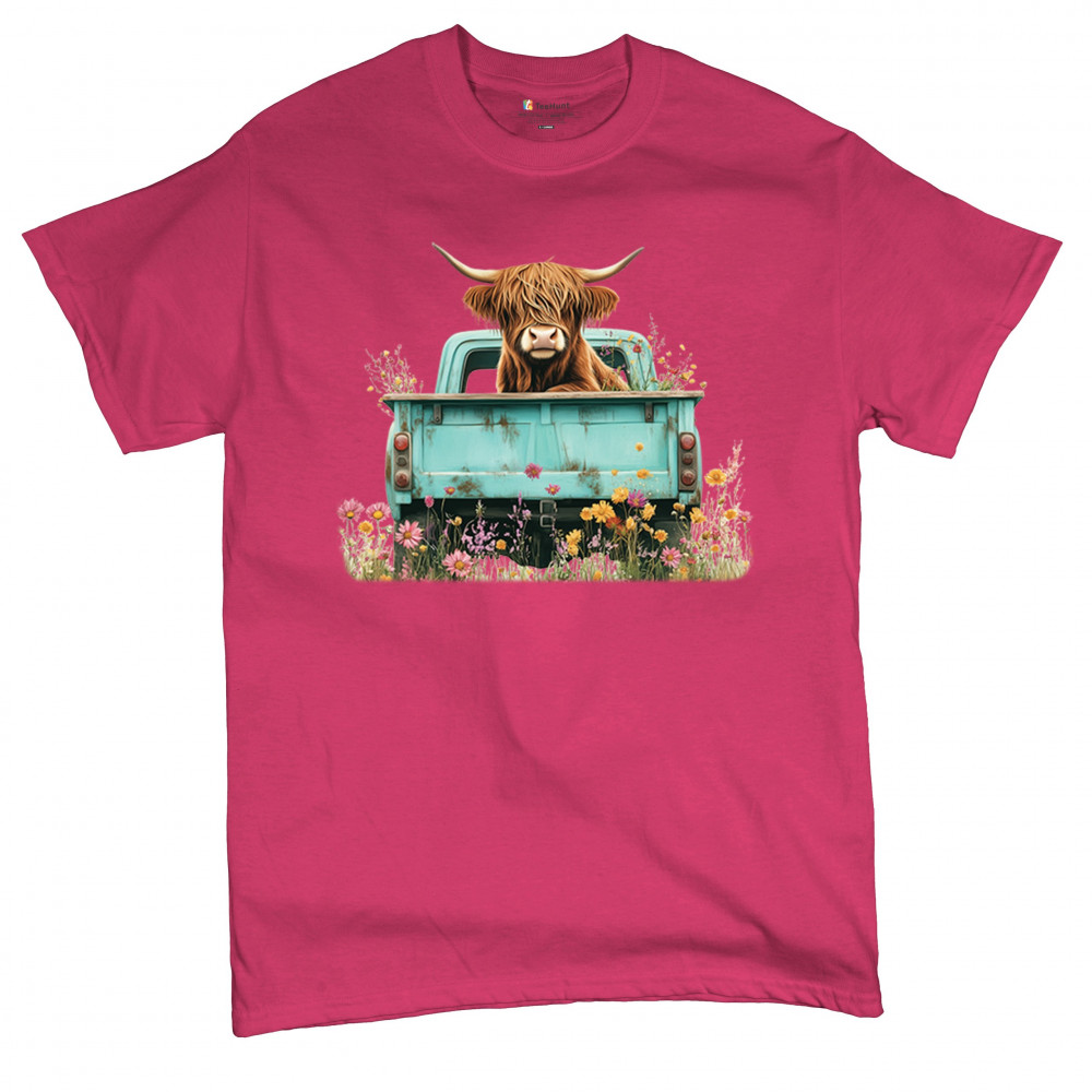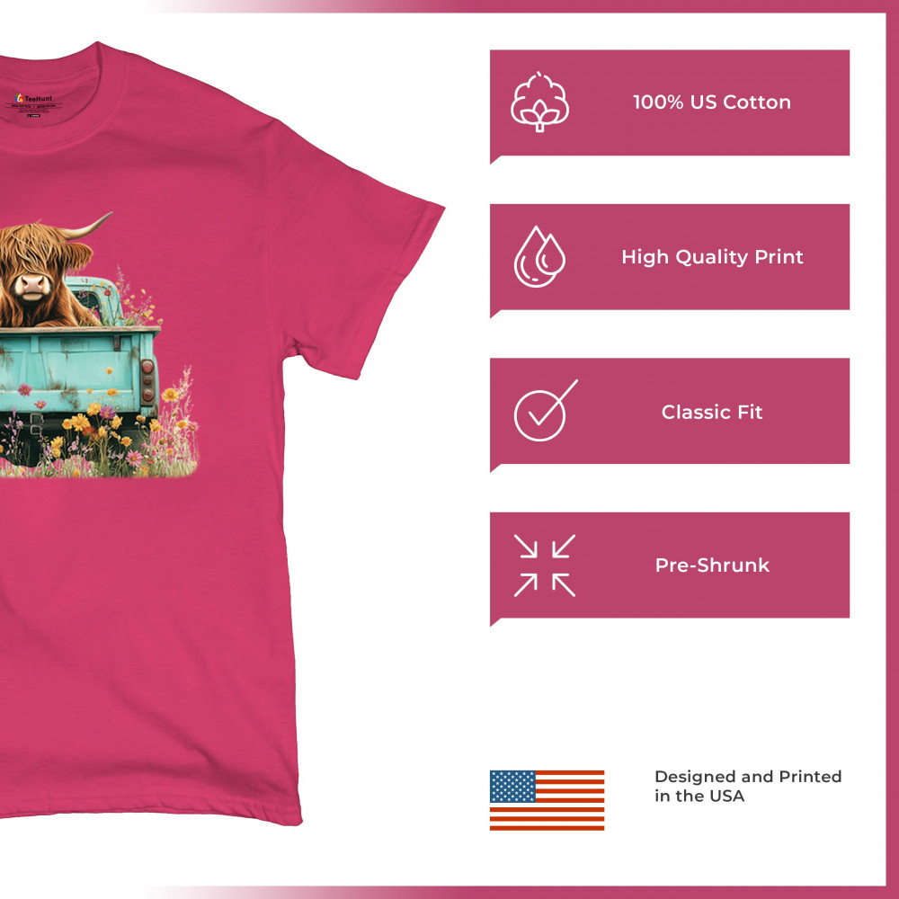 Celebrate rustic charm with this Highland Cow truck design, combining farmhouse floral truck art, boho ranch vibes, and country farmhouse shirt appeal. Perfect for cow lovers, barn style enthusiasts, and small town rural living. A vintage truck cow design that’s both cozy and stylish.