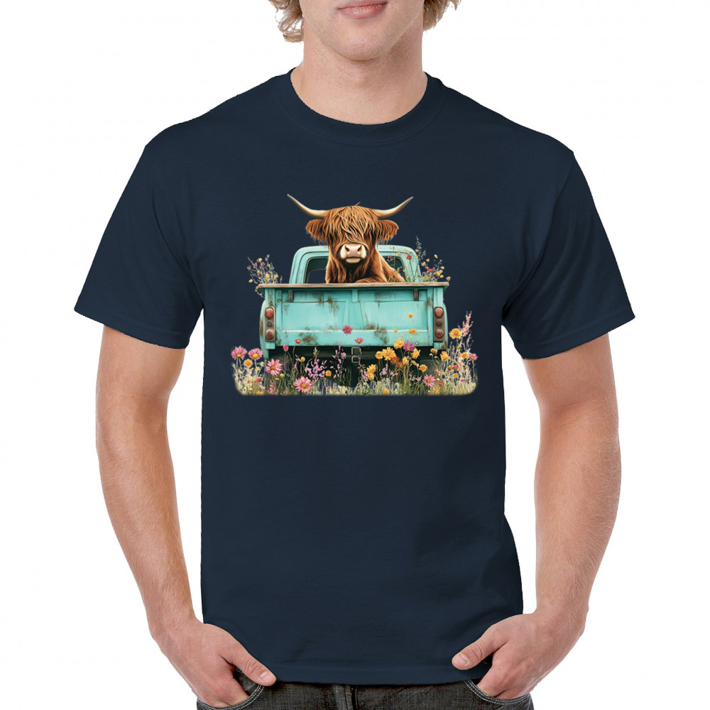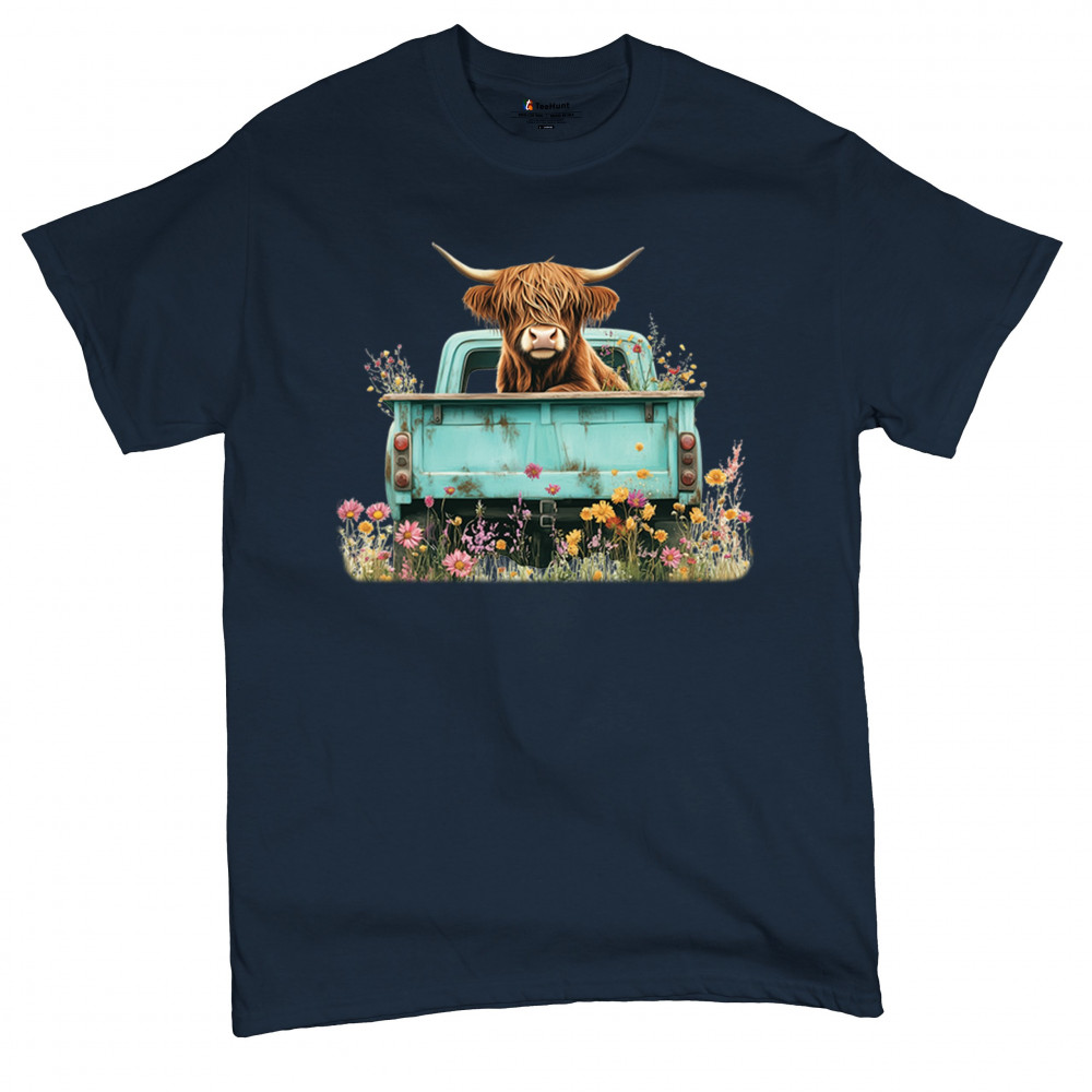 Celebrate rustic charm with this Highland Cow truck design, combining farmhouse floral truck art, boho ranch vibes, and country farmhouse shirt appeal. Perfect for cow lovers, barn style enthusiasts, and small town rural living. A vintage truck cow design that’s both cozy and stylish.