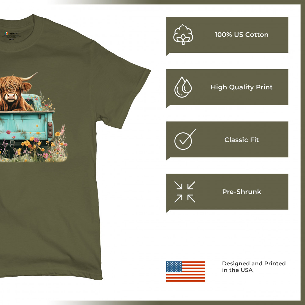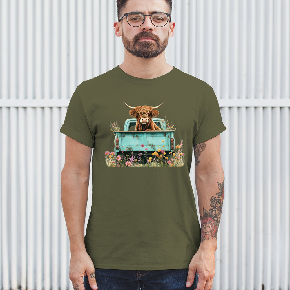 Celebrate rustic charm with this Highland Cow truck design, combining farmhouse floral truck art, boho ranch vibes, and country farmhouse shirt appeal. Perfect for cow lovers, barn style enthusiasts, and small town rural living. A vintage truck cow design that’s both cozy and stylish.