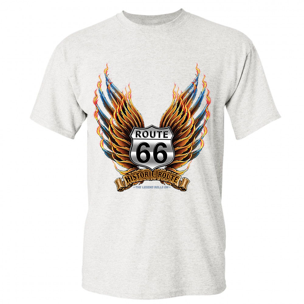 A print featuring a Route 66 sign with wings set on fire. The print says: "Historic Route, The Legend Rolls On". A great choice for a fan of the legendary Mother Road.