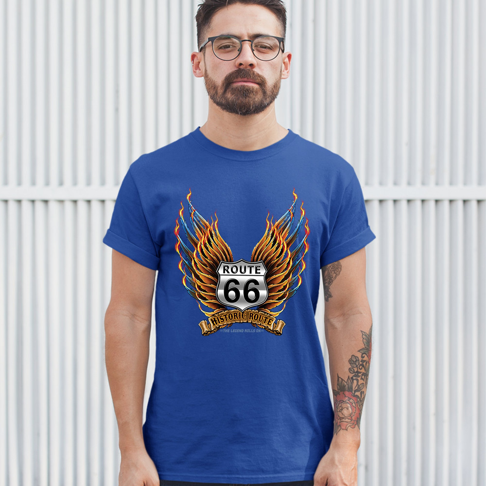 A print featuring a Route 66 sign with wings set on fire. The print says: "Historic Route, The Legend Rolls On". A great choice for a fan of the legendary Mother Road.