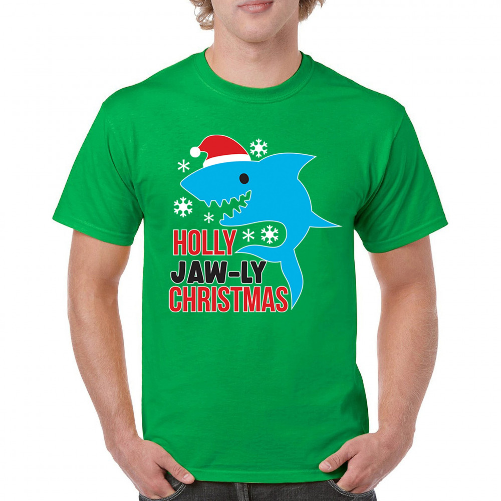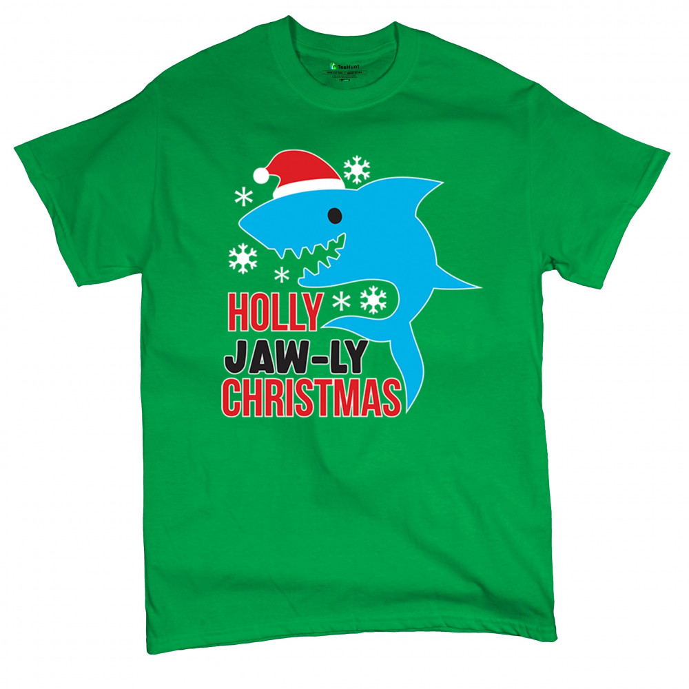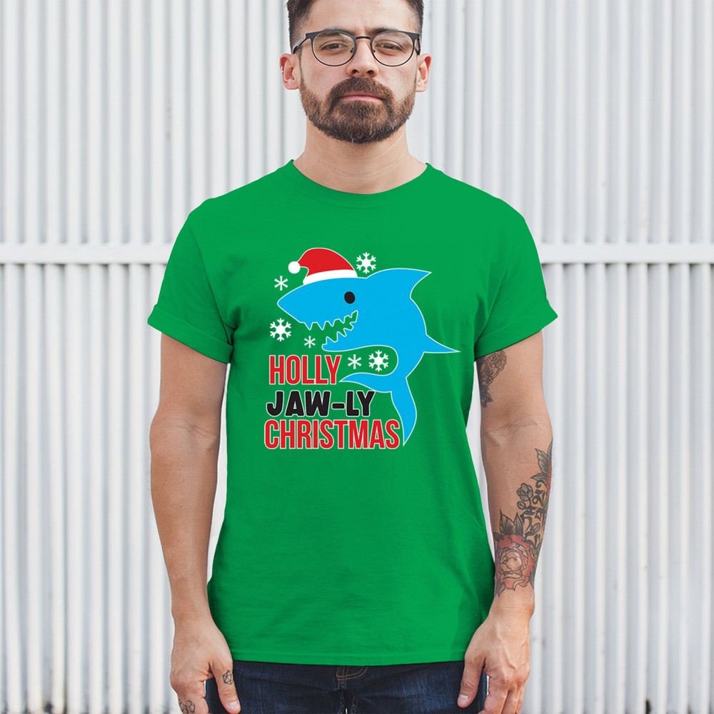 Funny Holly Jaw-ly Christmas shark pun design with Santa hat and snowflakes. Perfect for ocean lovers, festive parties, and cheerful holiday fun.