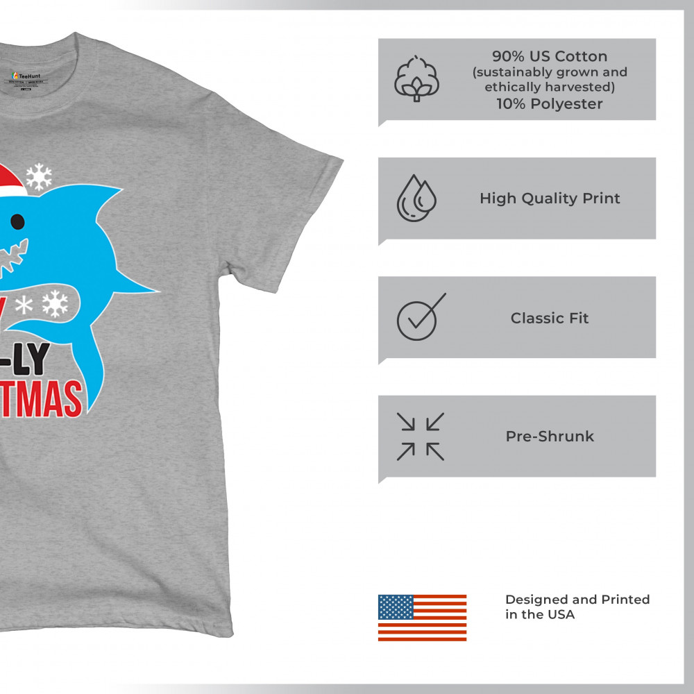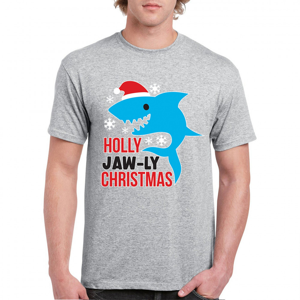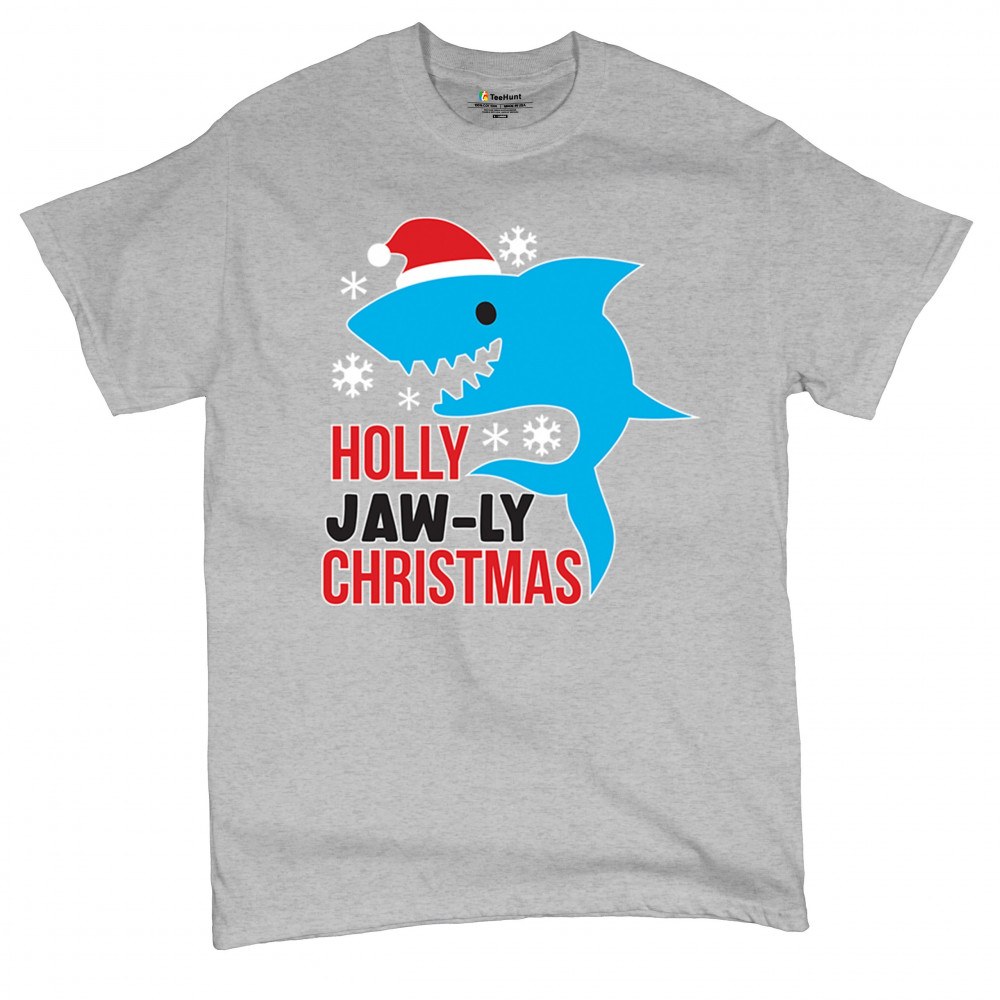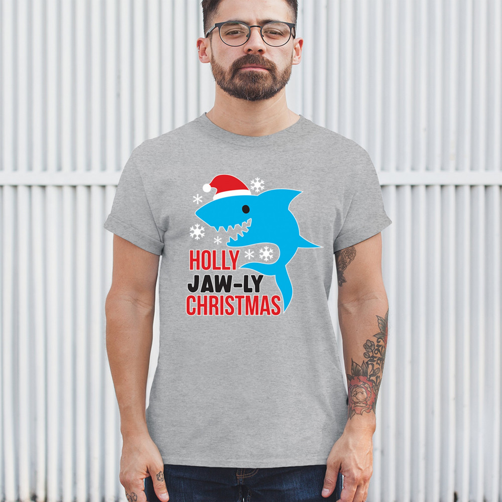 Funny Holly Jaw-ly Christmas shark pun design with Santa hat and snowflakes. Perfect for ocean lovers, festive parties, and cheerful holiday fun.