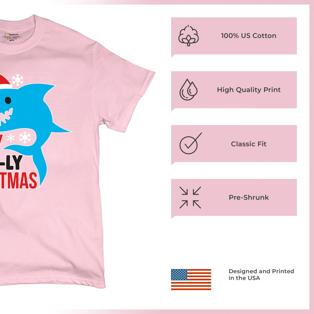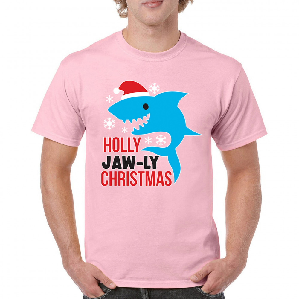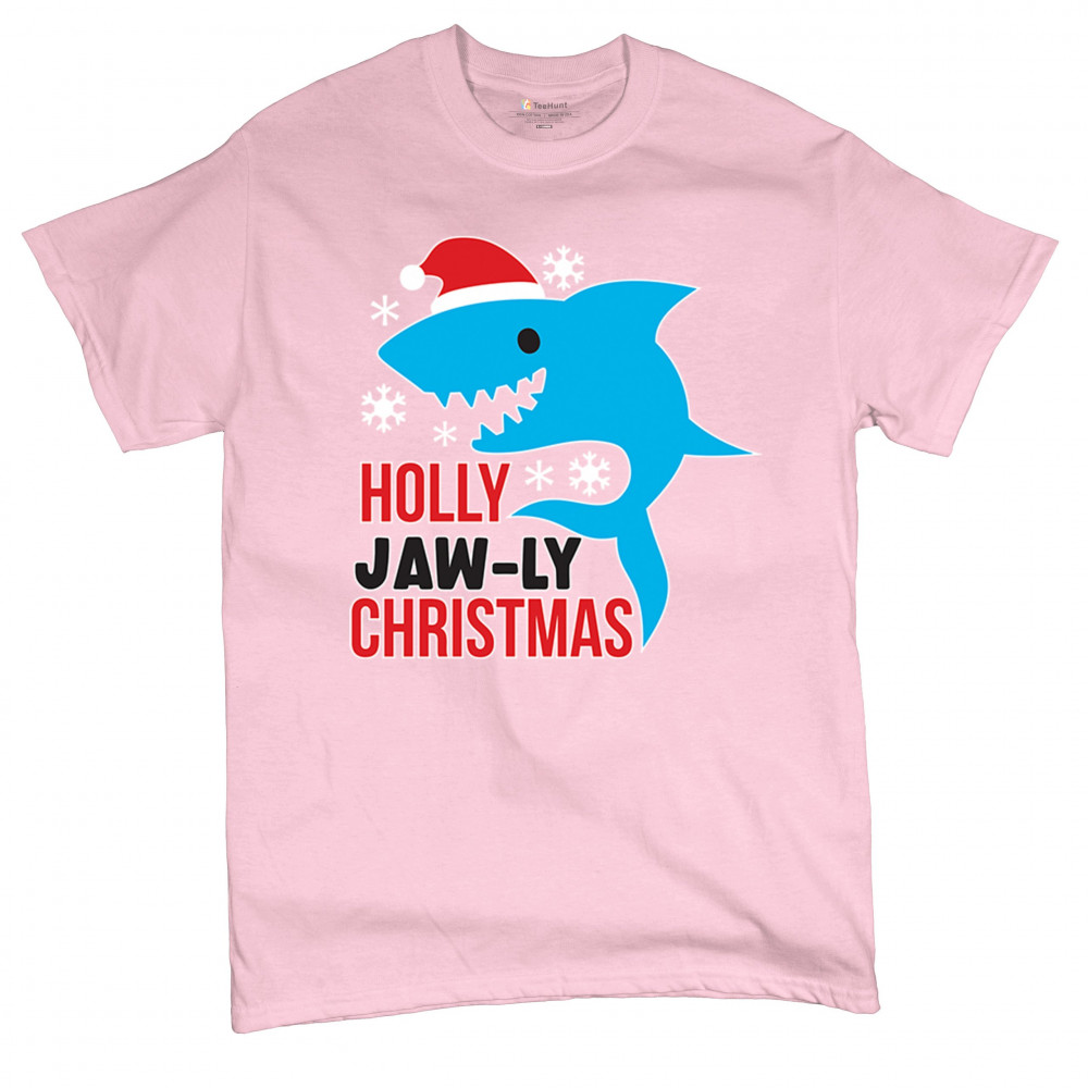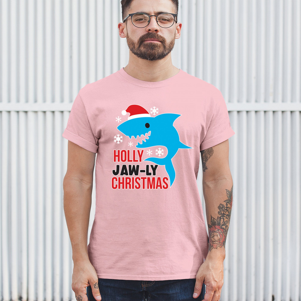 Funny Holly Jaw-ly Christmas shark pun design with Santa hat and snowflakes. Perfect for ocean lovers, festive parties, and cheerful holiday fun.