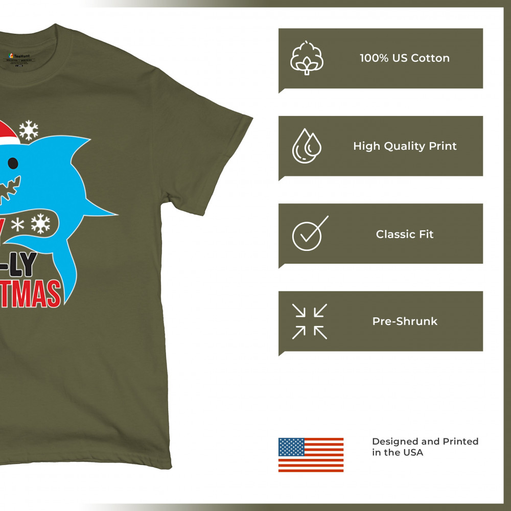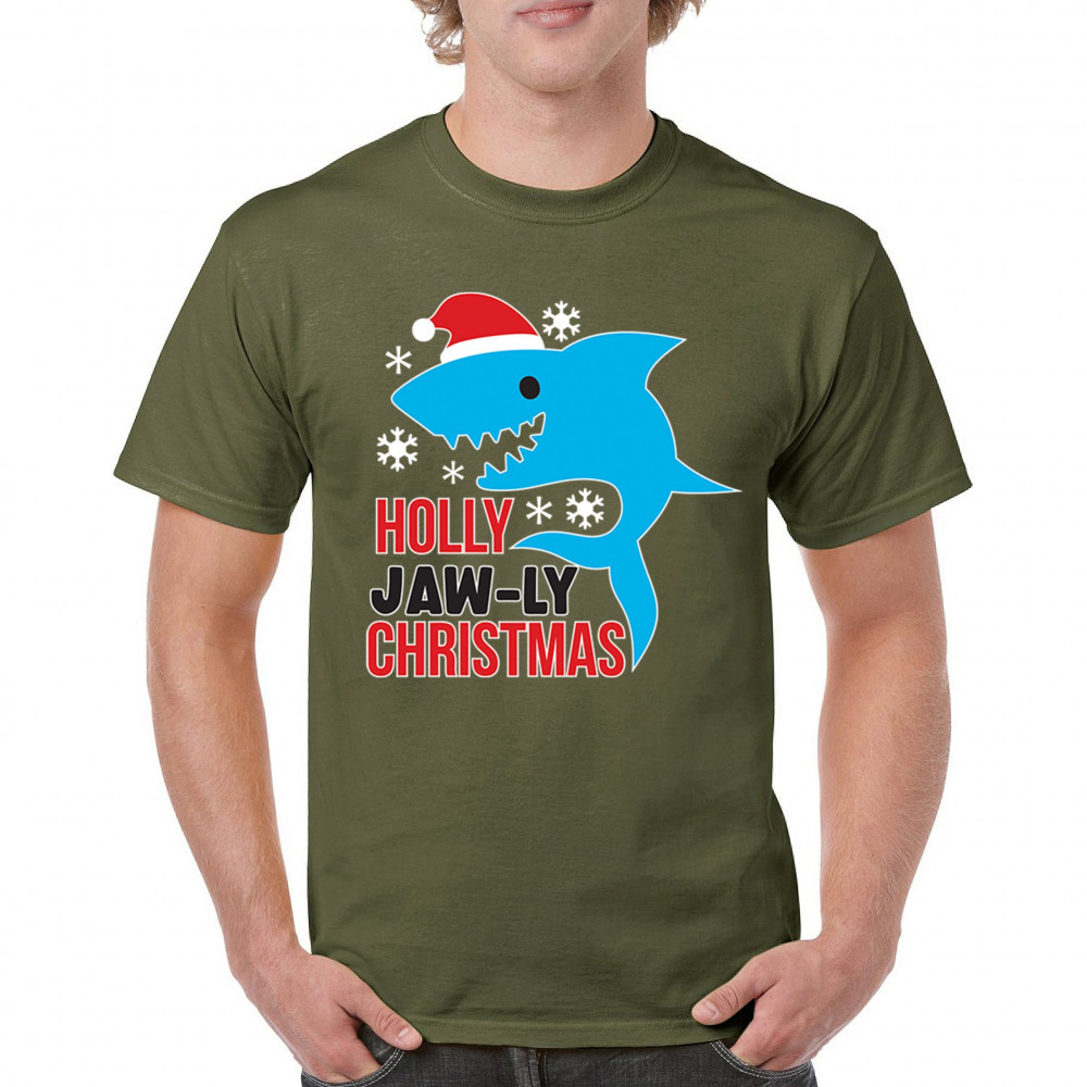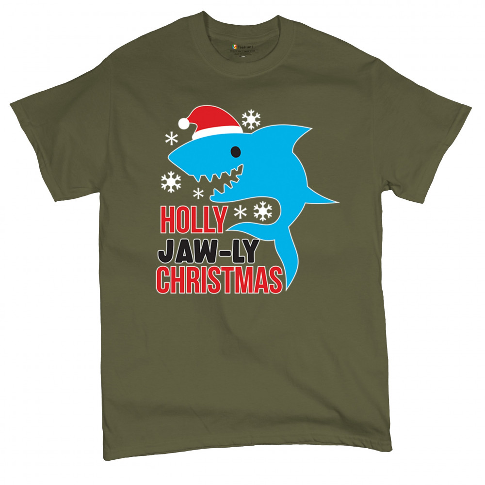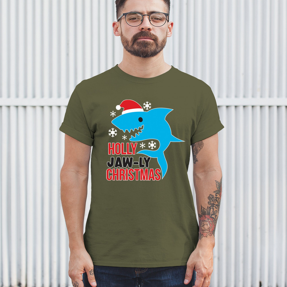 Funny Holly Jaw-ly Christmas shark pun design with Santa hat and snowflakes. Perfect for ocean lovers, festive parties, and cheerful holiday fun.