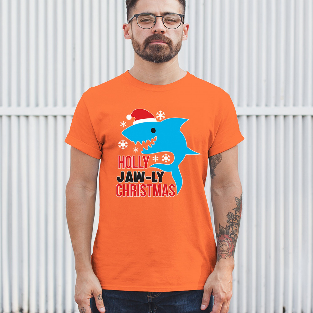 Funny Holly Jaw-ly Christmas shark pun design with Santa hat and snowflakes. Perfect for ocean lovers, festive parties, and cheerful holiday fun.