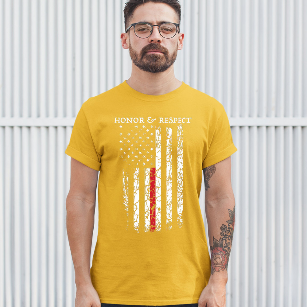 HONOR & RESPECT THIN RED LINE t-shirt firefighter american flag men's tee yellow