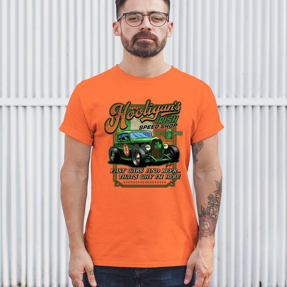 HOOLIGAN'S IRISH SPEED SHOP hooligans irish speed shop st patricks day t-shirt hot rod shamrock men's tee orange