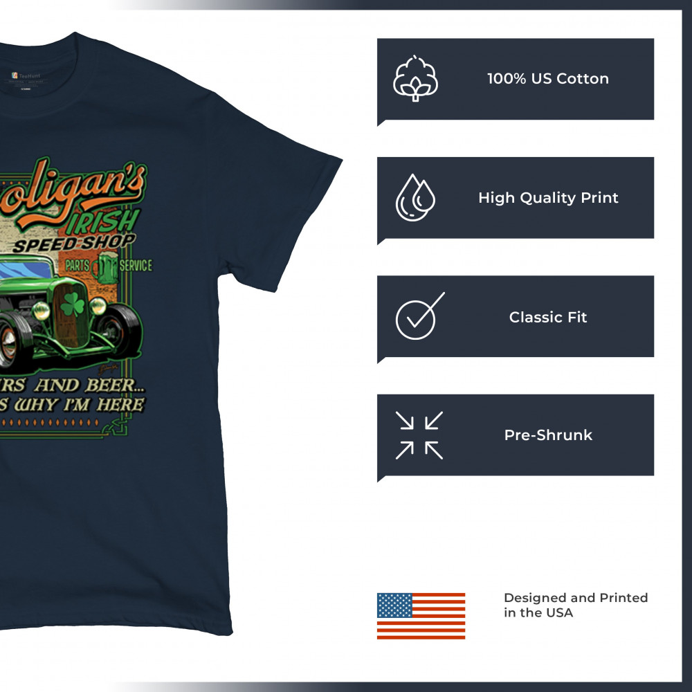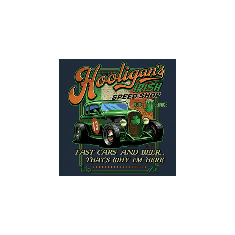 Celebrate St. Patrick's Day in style with the Hooligan Speed Shop T-Shirt, featuring a bold design of the Irish flag perfect for showcasing your pride while adding flair to any festive occasion.