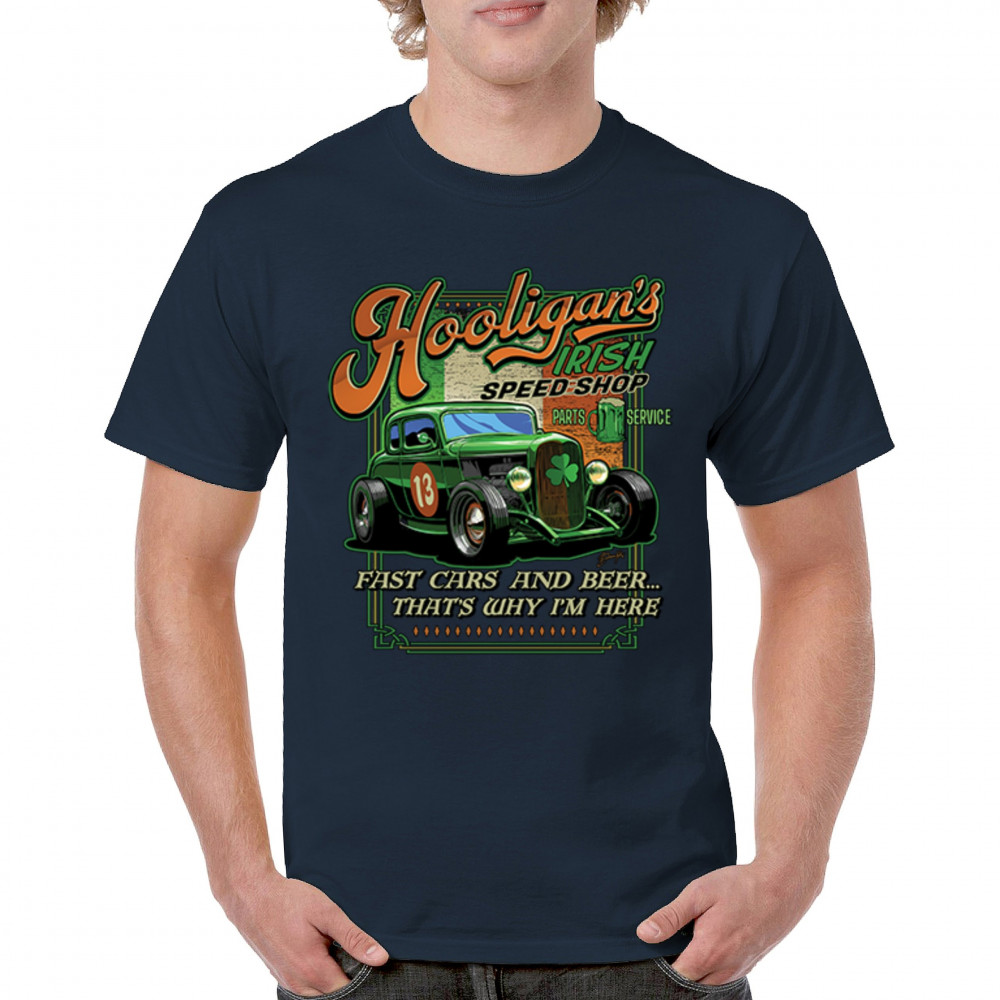 HOOLIGAN'S IRISH SPEED SHOP hooligans irish speed shop st patricks day t-shirt hot rod shamrock men's tee navy blue