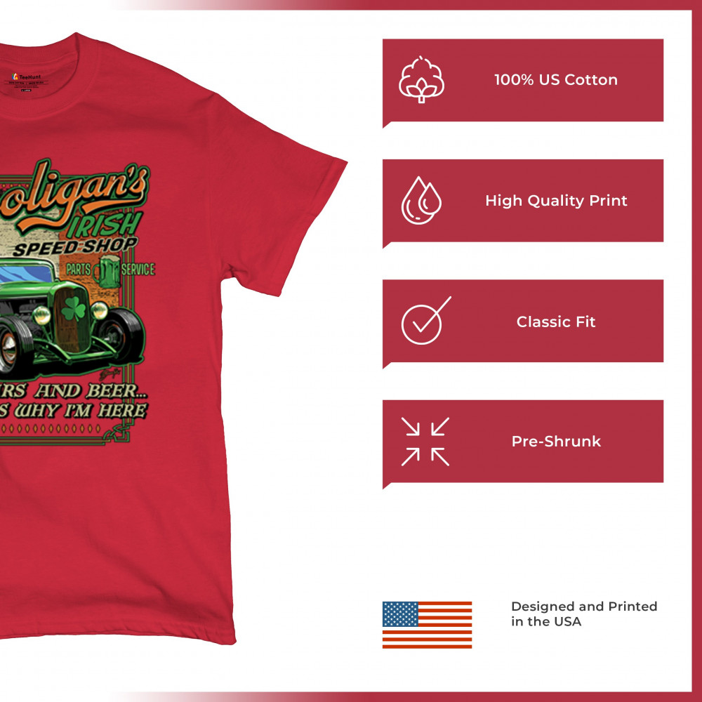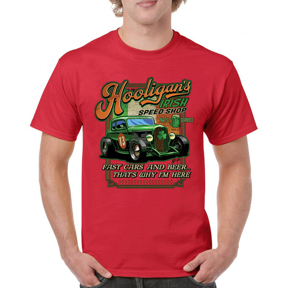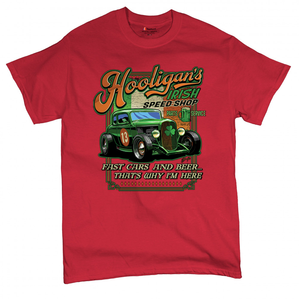 HOOLIGAN'S IRISH SPEED SHOP hooligans irish speed shop st patricks day t-shirt hot rod shamrock men's tee red