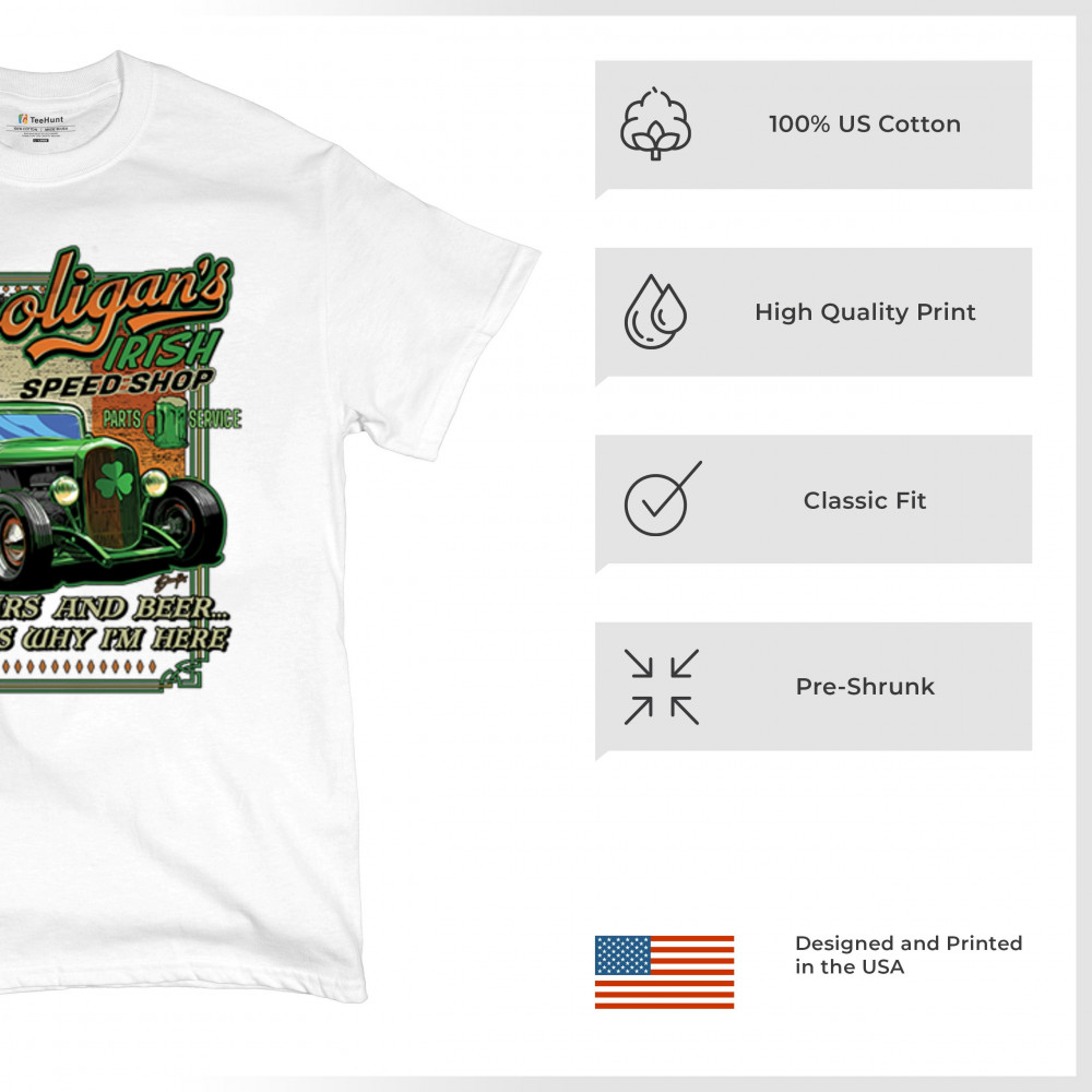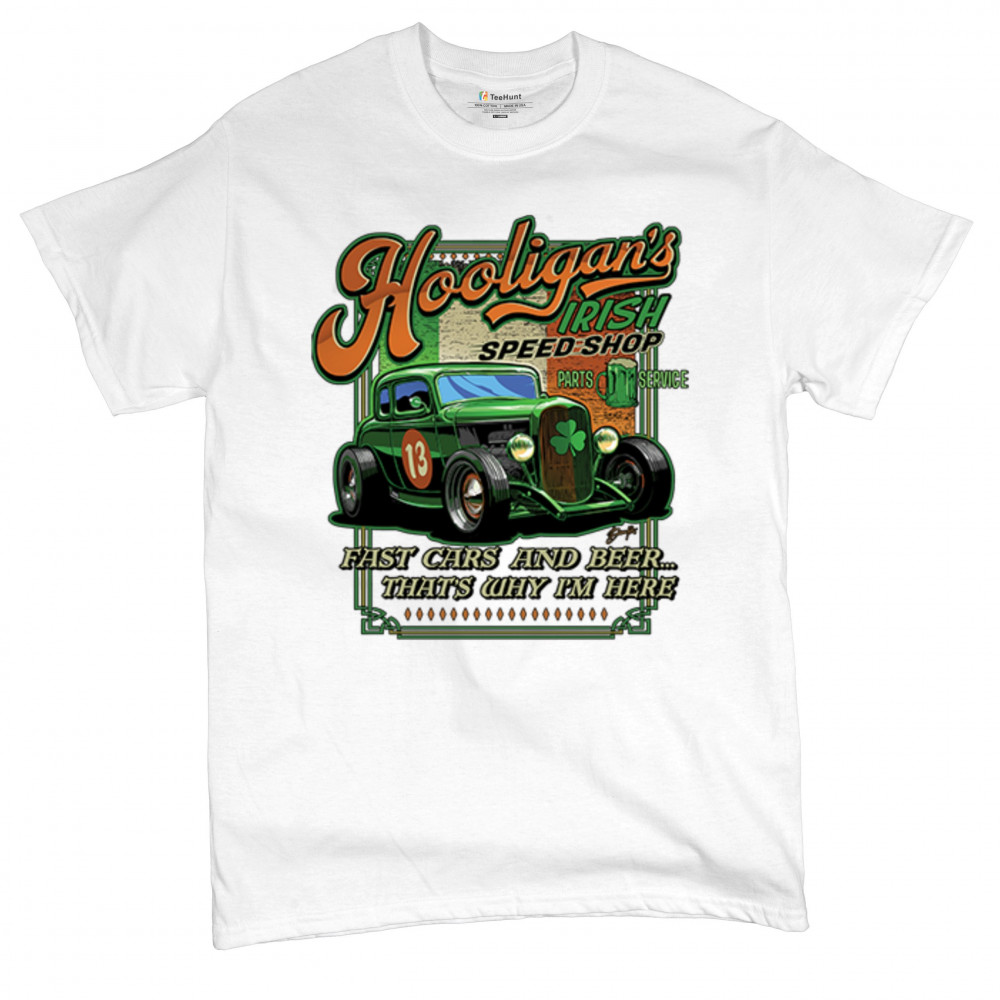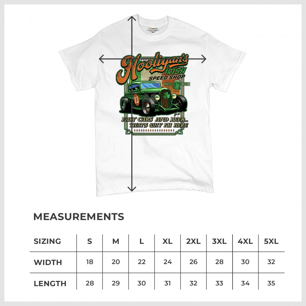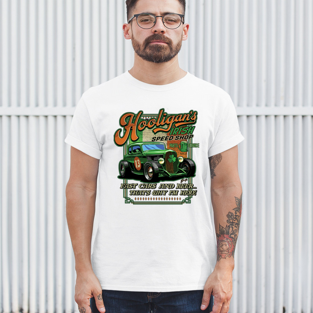 Celebrate St. Patrick's Day in style with the Hooligan Speed Shop T-Shirt, featuring a bold design of the Irish flag perfect for showcasing your pride while adding flair to any festive occasion.