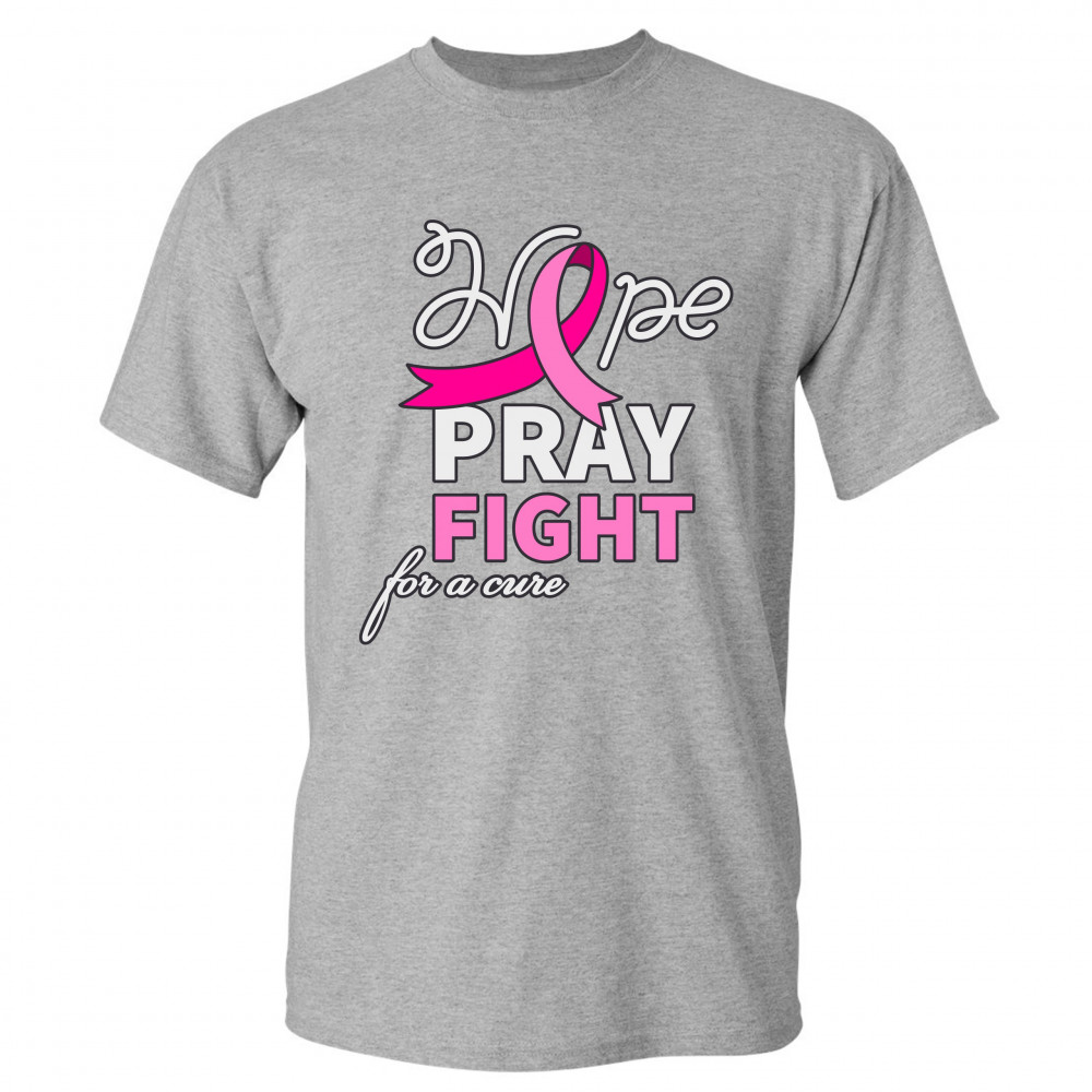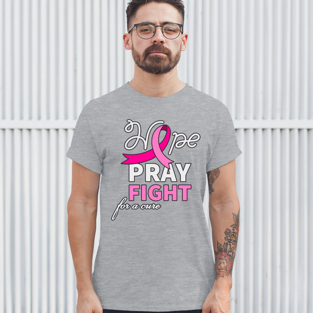 HOPE PRAY FIGHT FOR A CURE t-shirt cancer awareness pink ribbon men's tee gray