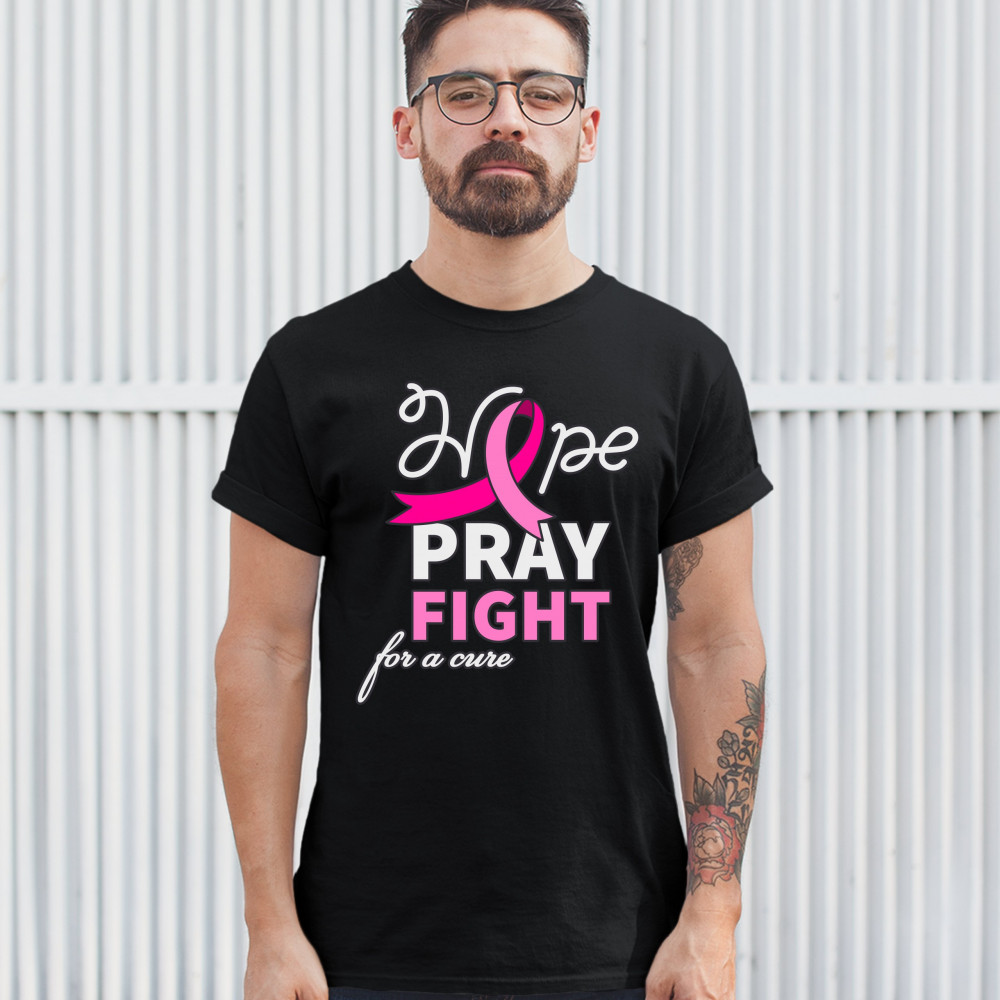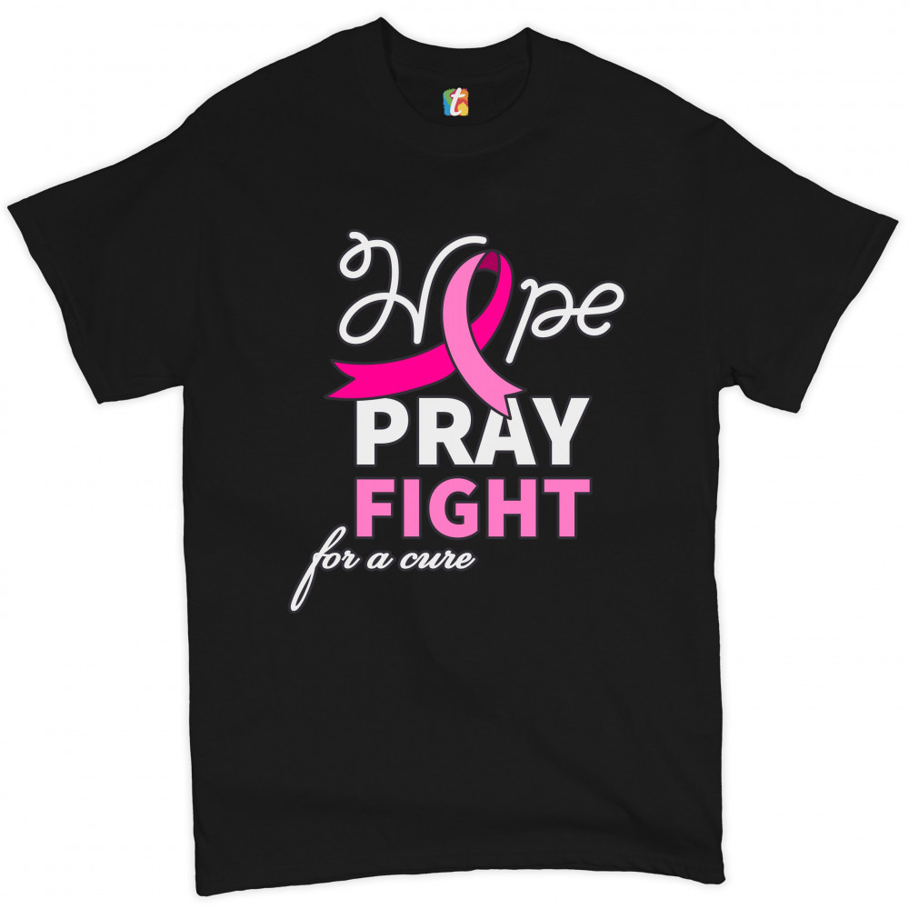 HOPE PRAY FIGHT FOR A CURE t-shirt cancer awareness pink ribbon men's tee black
